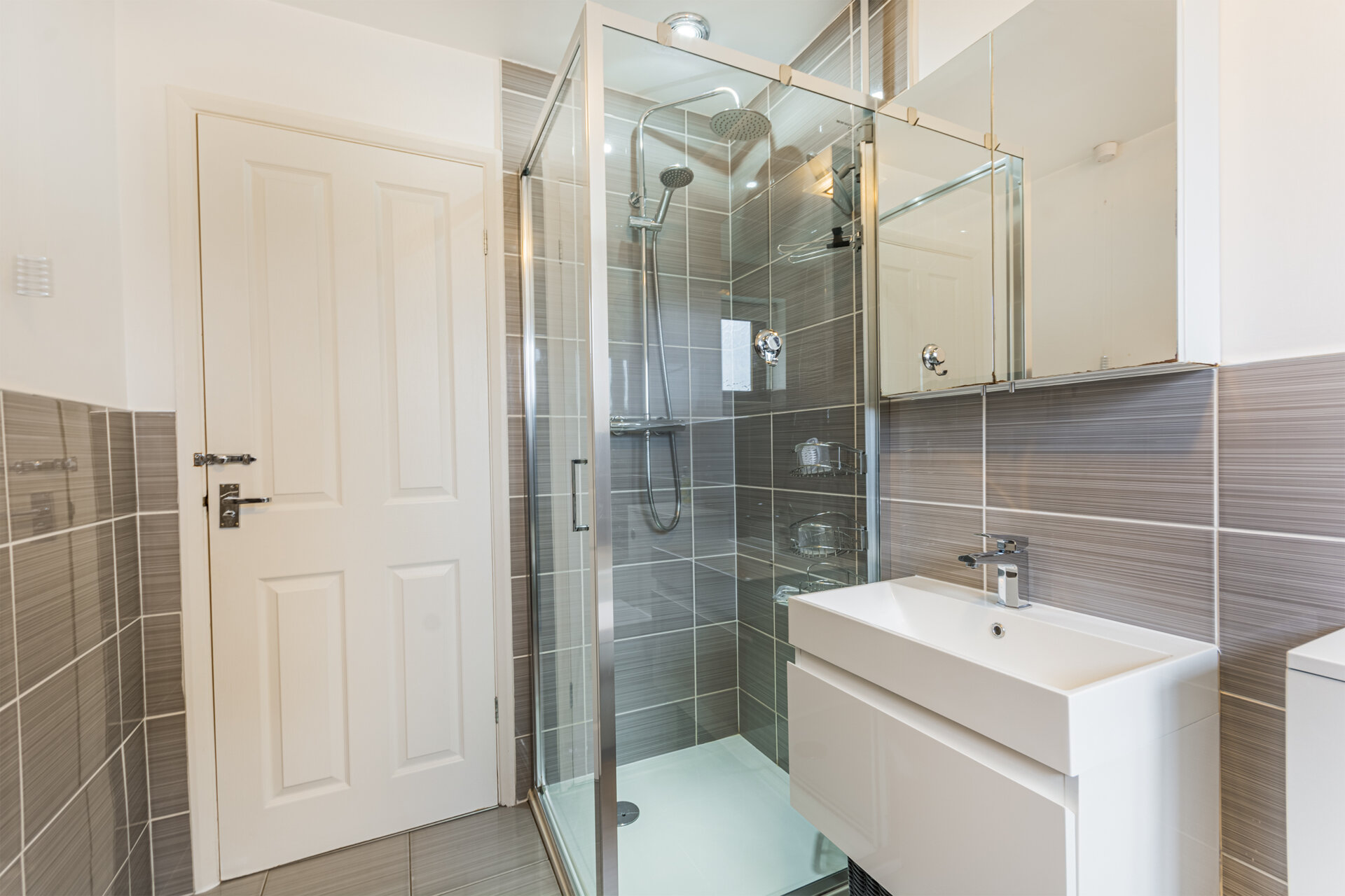 Comprising a four piece suite of: low flush w.c and wash hand basin set into vanity unit, corner shower unit with mains fed shower above, panelled bath, tiled splash backs, heated ladder style radiator, double glazed window to the side elevation, tiling to the floor.