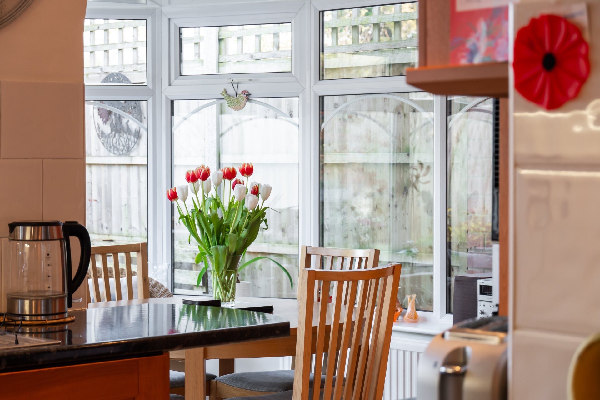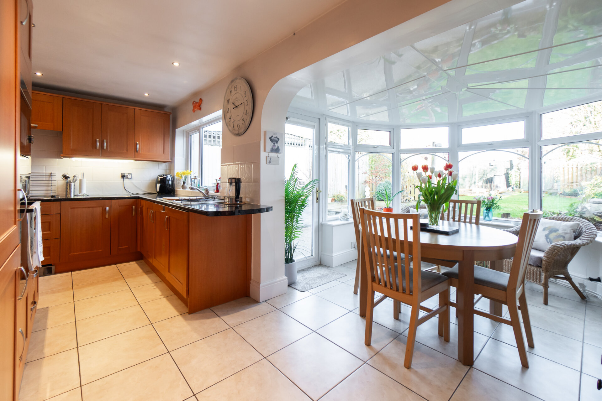 A fantastic extra room with continued tiled flooring, double glazed windows to all three sides giving a panoramic view over the wonderful garden, two radiators, double glazed door to the left elevation.