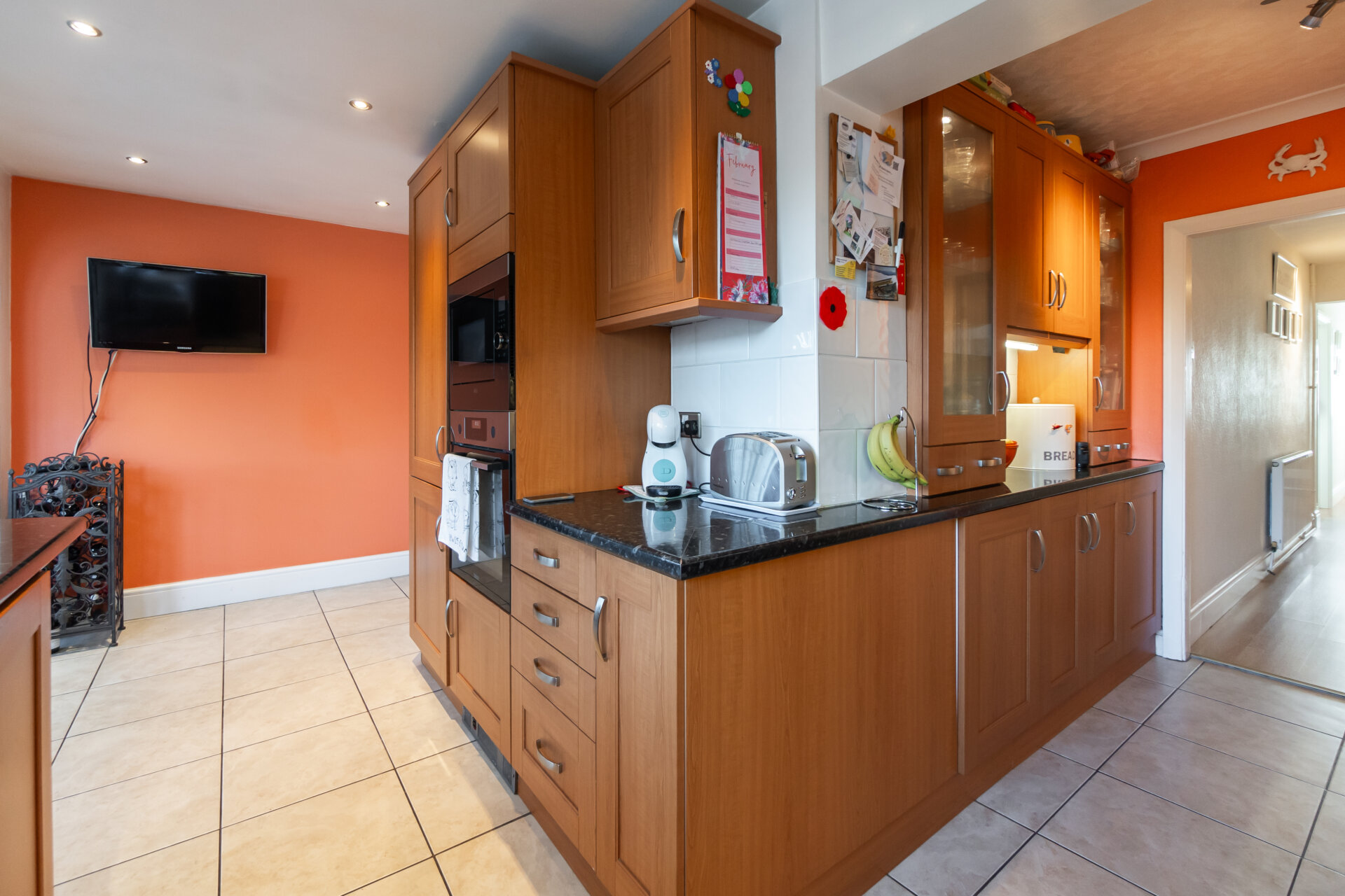 Range of wall and base units with roll top work surfaces, standing height oven and grill, gas hobs with extractor hood, integrated dish washer, fridge freezer, tiled flooring, double glazed window to the rear, pantry cupboard and double glazed door to the left elevation.