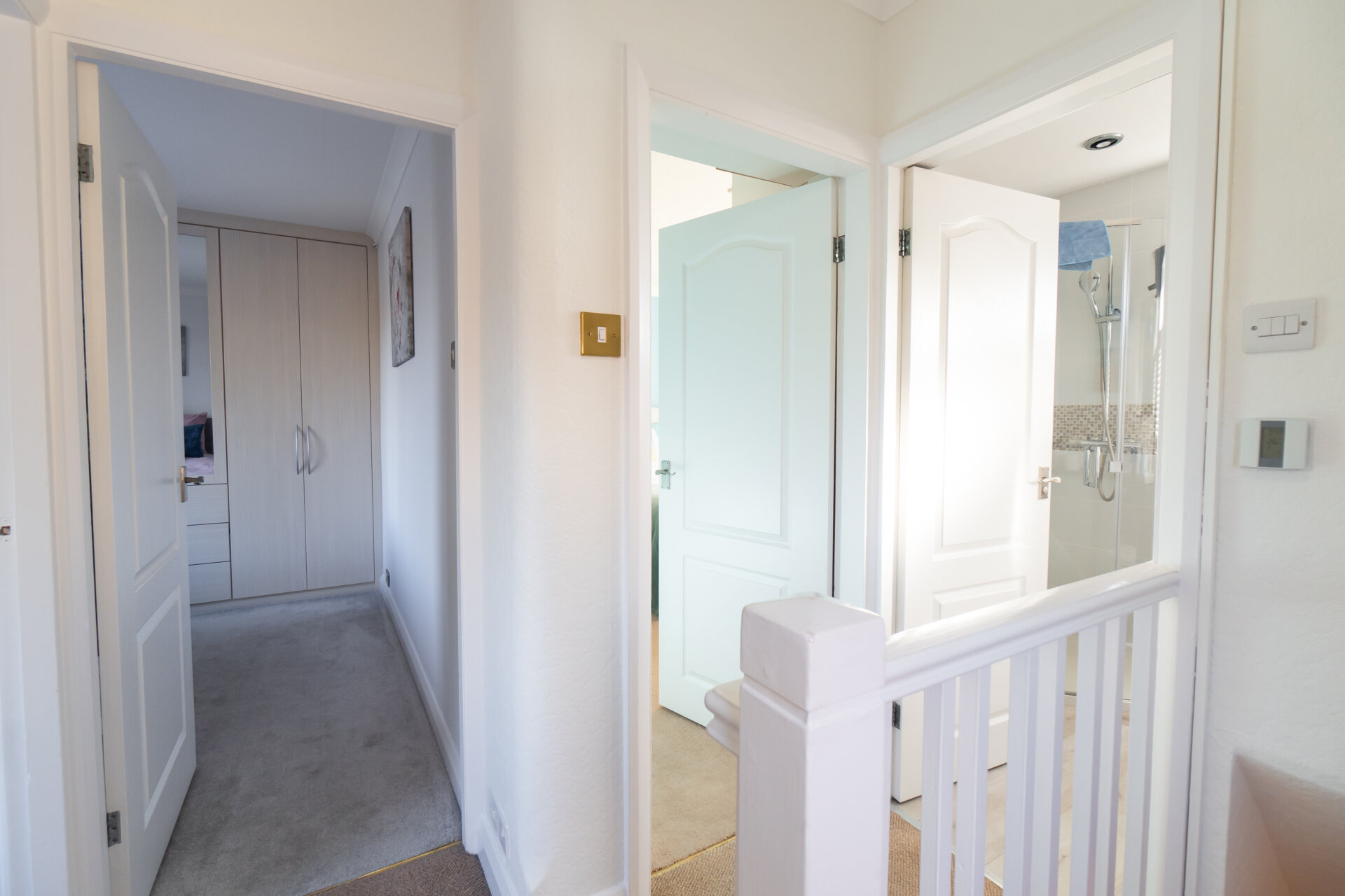Carpet to both stairs and landing, with balustrade, double glazed window to the left elevation, and doors to bedrooms and bathroom.