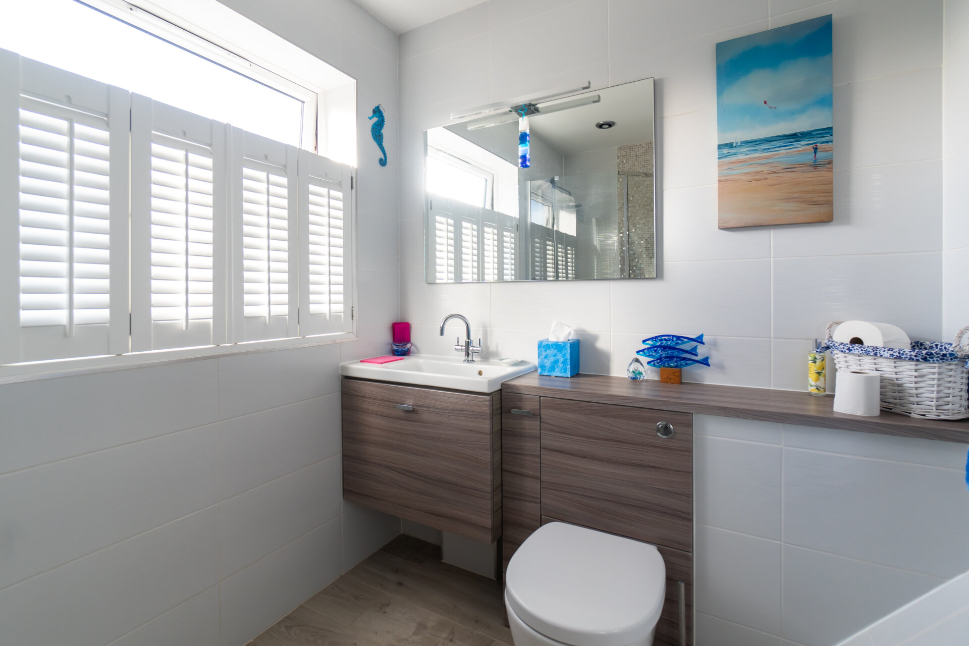 A stunning refitted Shower suite comprising a large corner shower cubicle, waterfall shower with mixer, vanity unit with floating wc,wash hand basin and storage cupboard, ladder style radiator, tiled walls, double glazed window to the front with fitted window shutters.