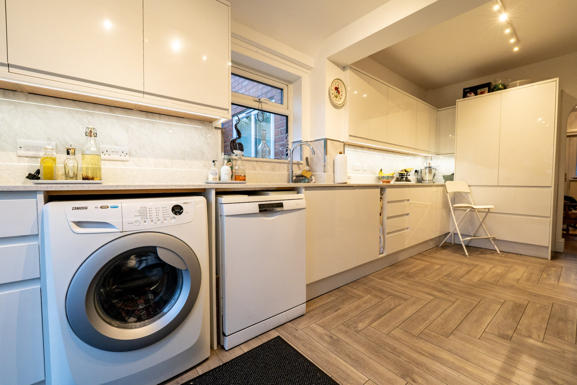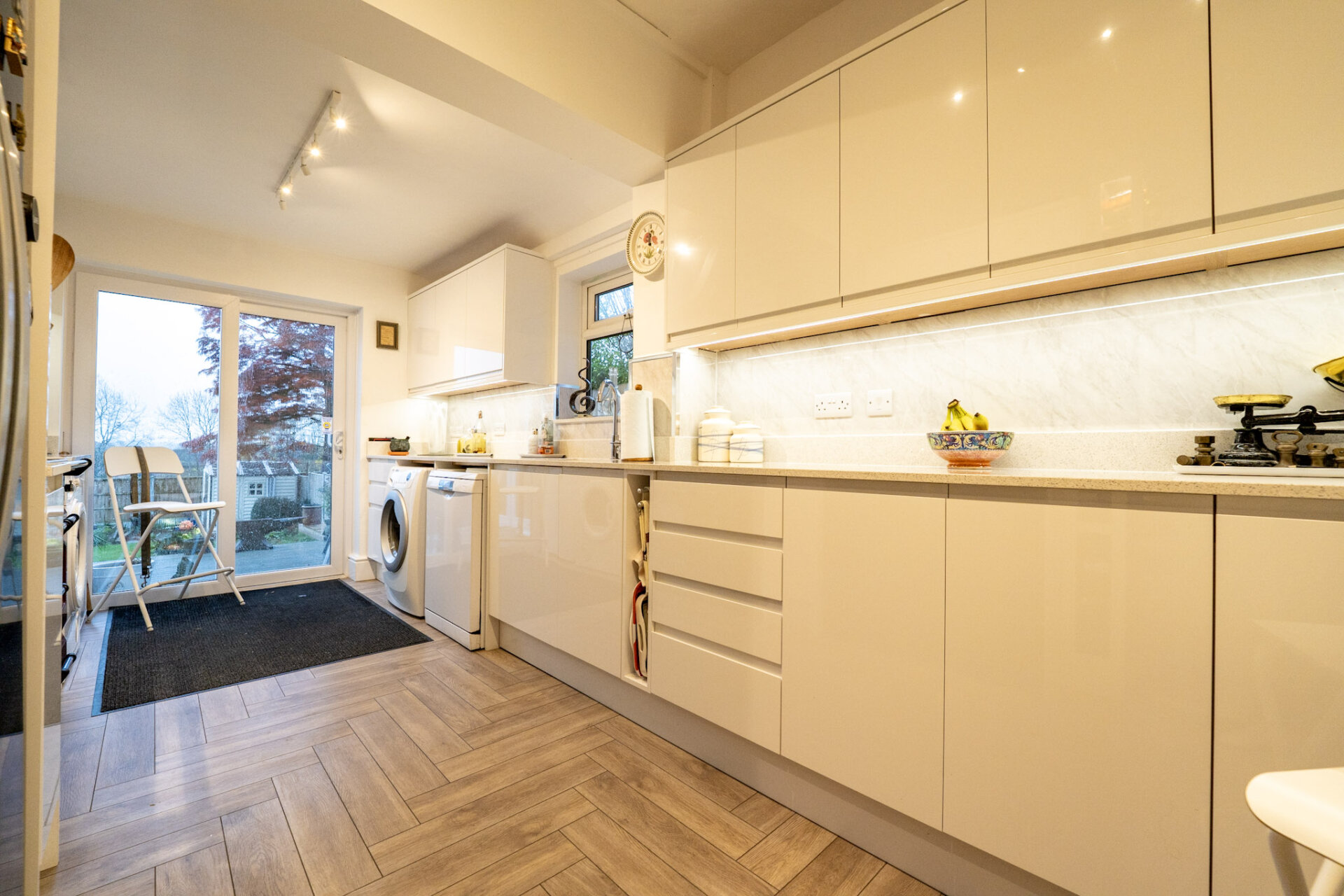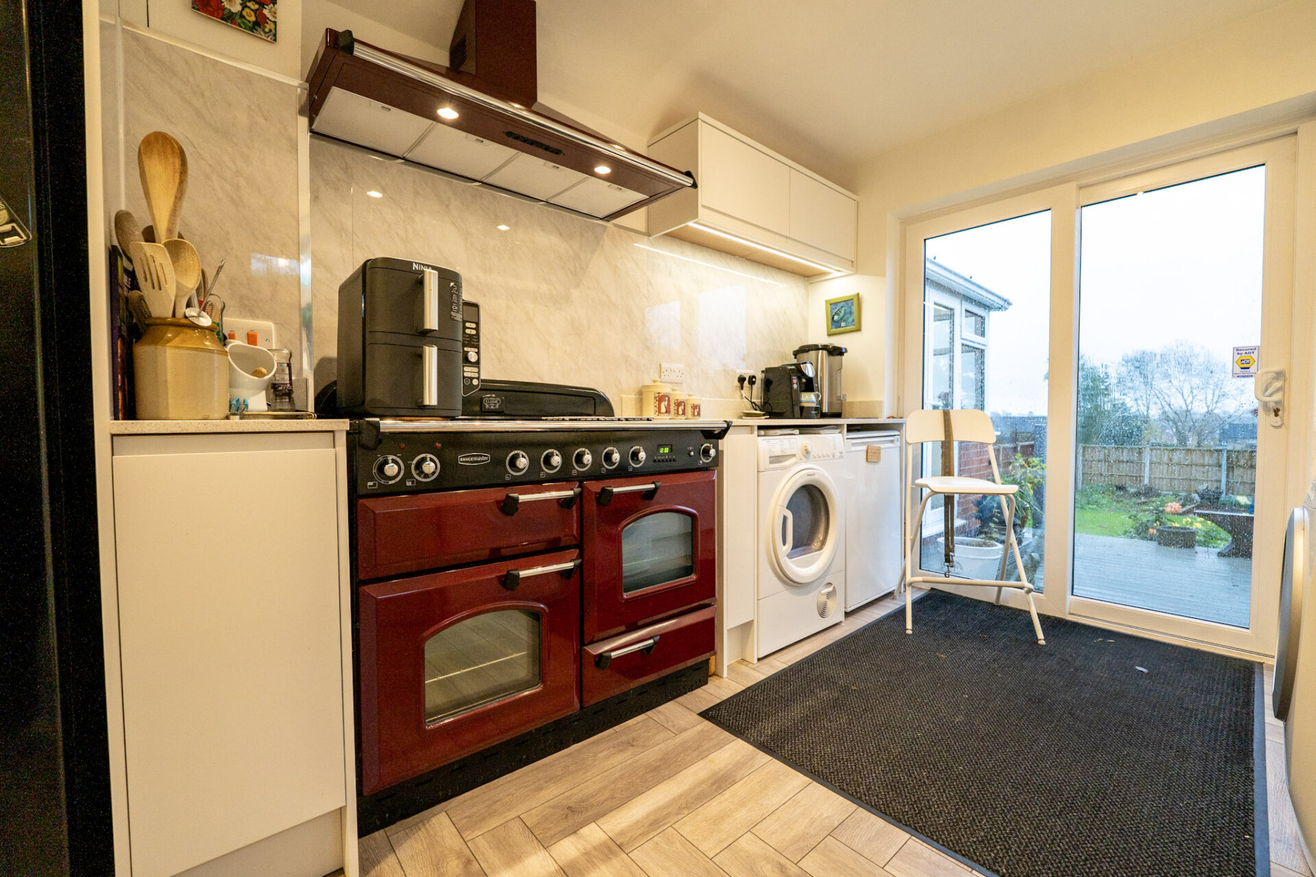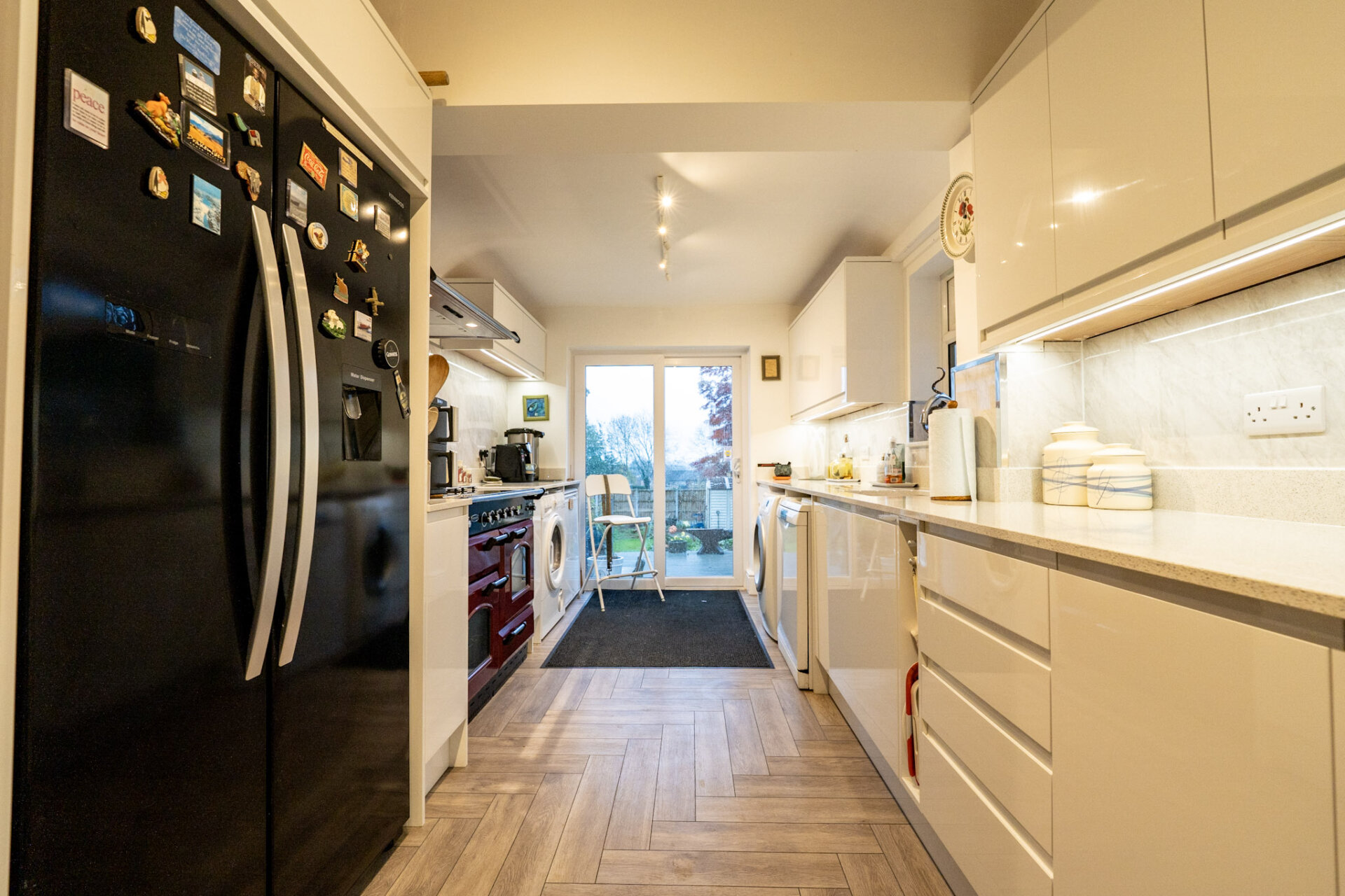 New refitted kitchen, with a range of wall and base units, quartz worktops, with inset sink with mixer tap, washing machine dryer and dishwasher, american fridge freezer, range master with hood, radiator, double glazed window to the right elevation and double glazed sliding patio doors to the rear elevation.