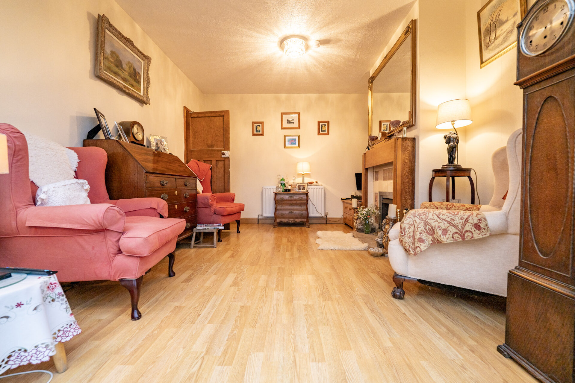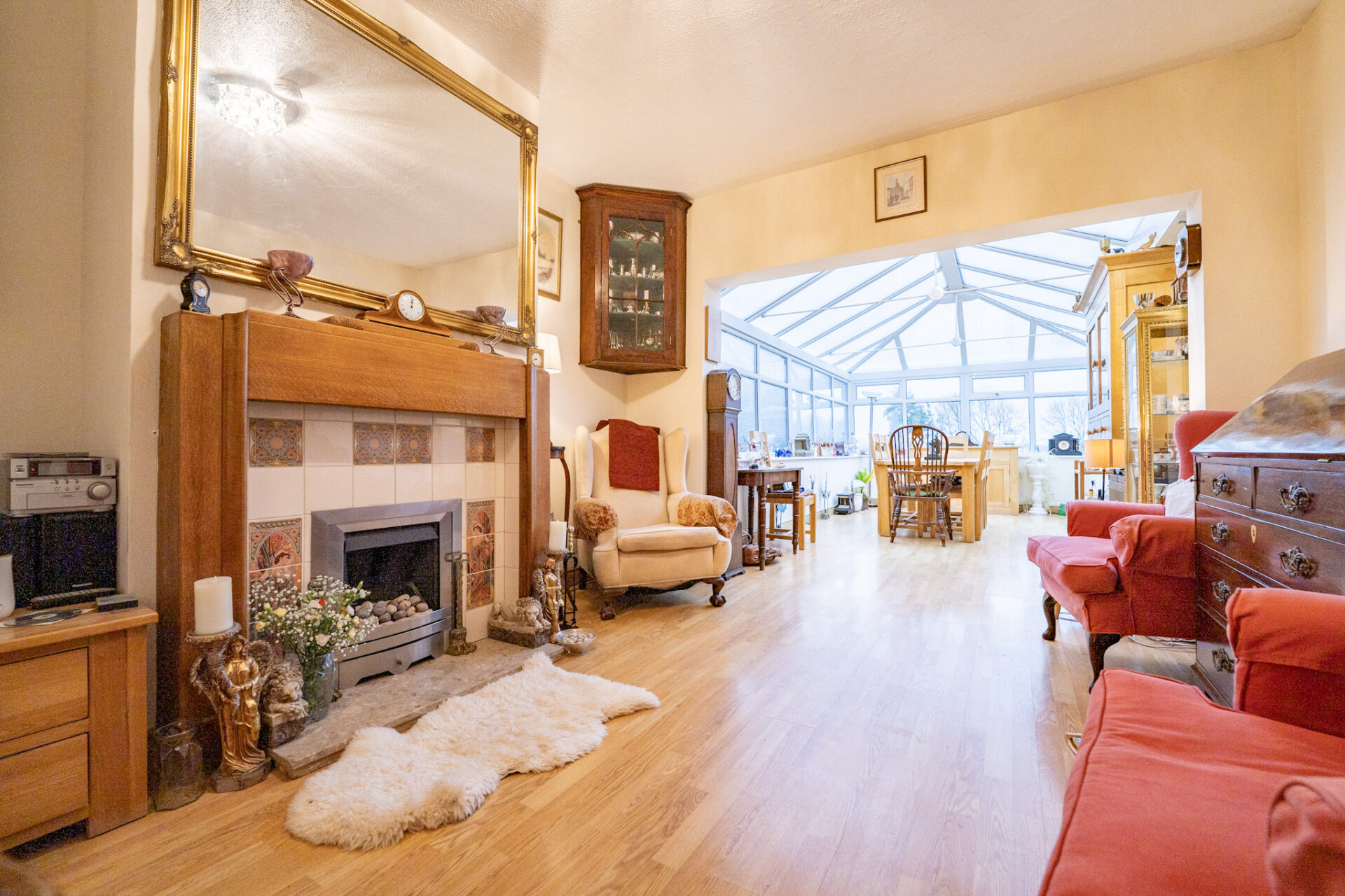 With chimney breast gas effect fired surround mantle and marble hearth, recess alcove to either side, wood effect to laminate flooring, radiator and open arch to conservatory.