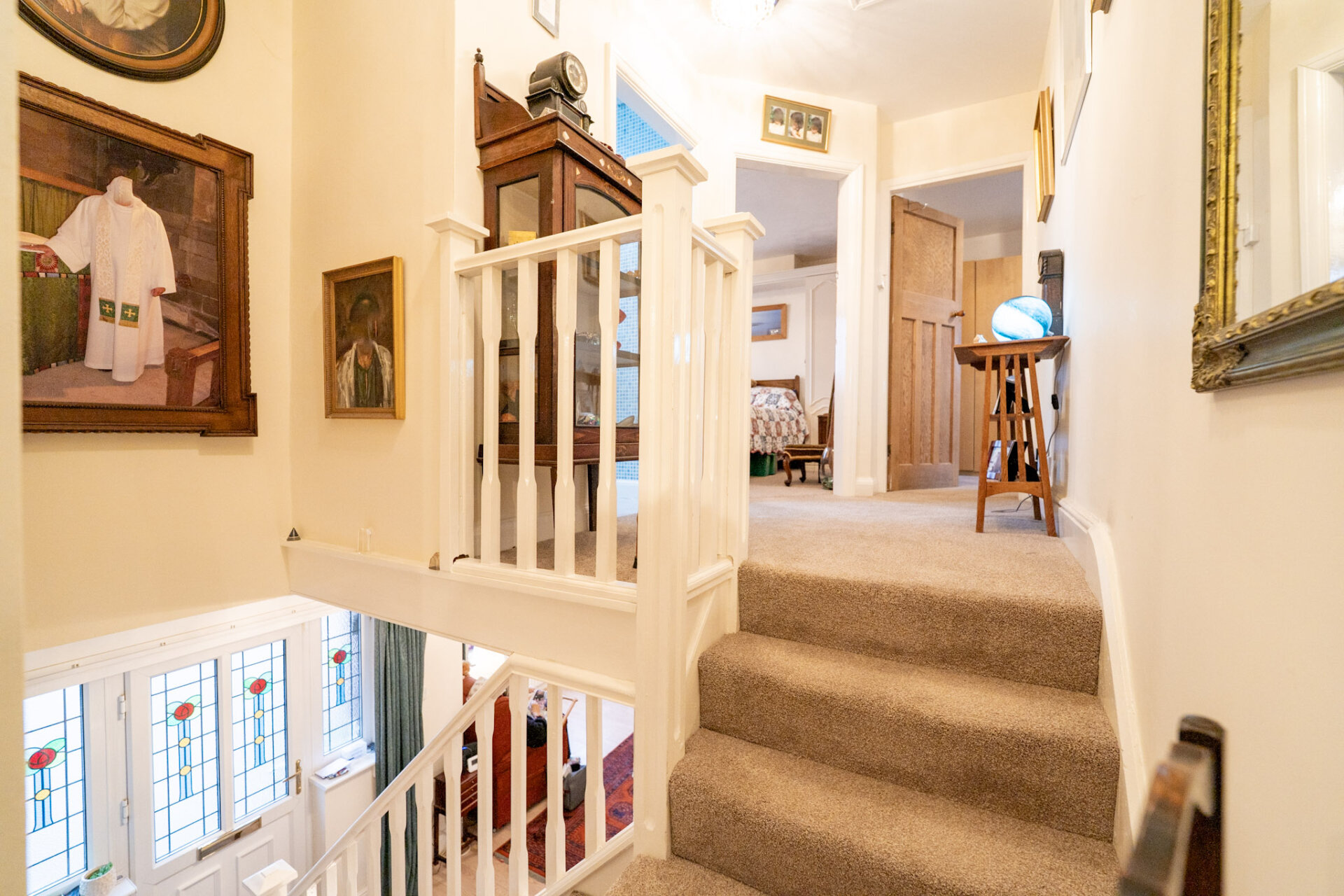 A spacious landing with carpet to both stairs and split landing, loft hatch for access.