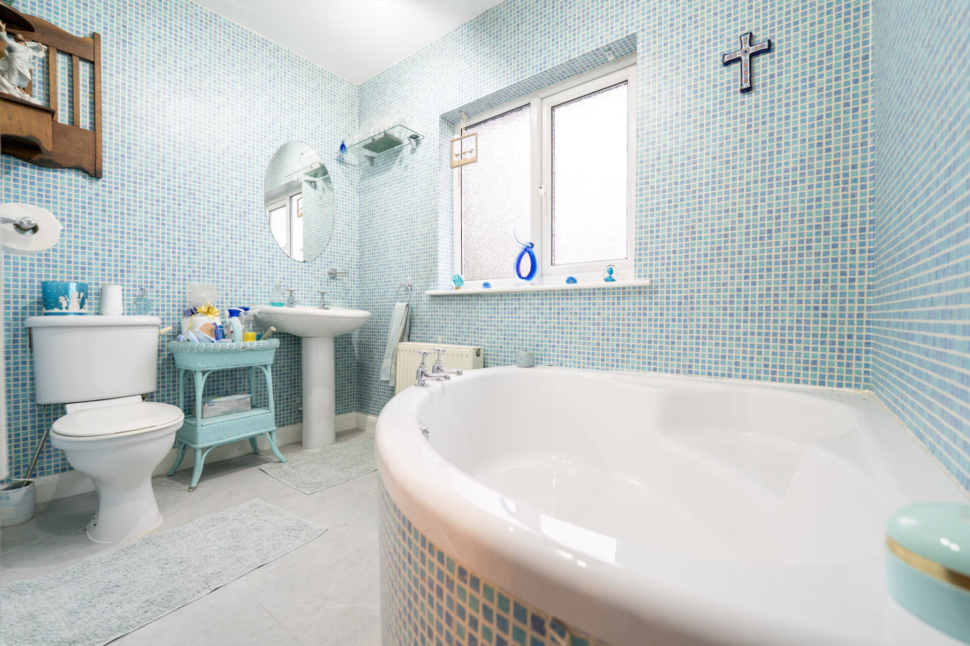 Three piece white suite comprising a corner bath, pedestal wash hand-basin, WC, radiator opaque double glazed window to the front elevation, airing cupboard housing the combination boiler.