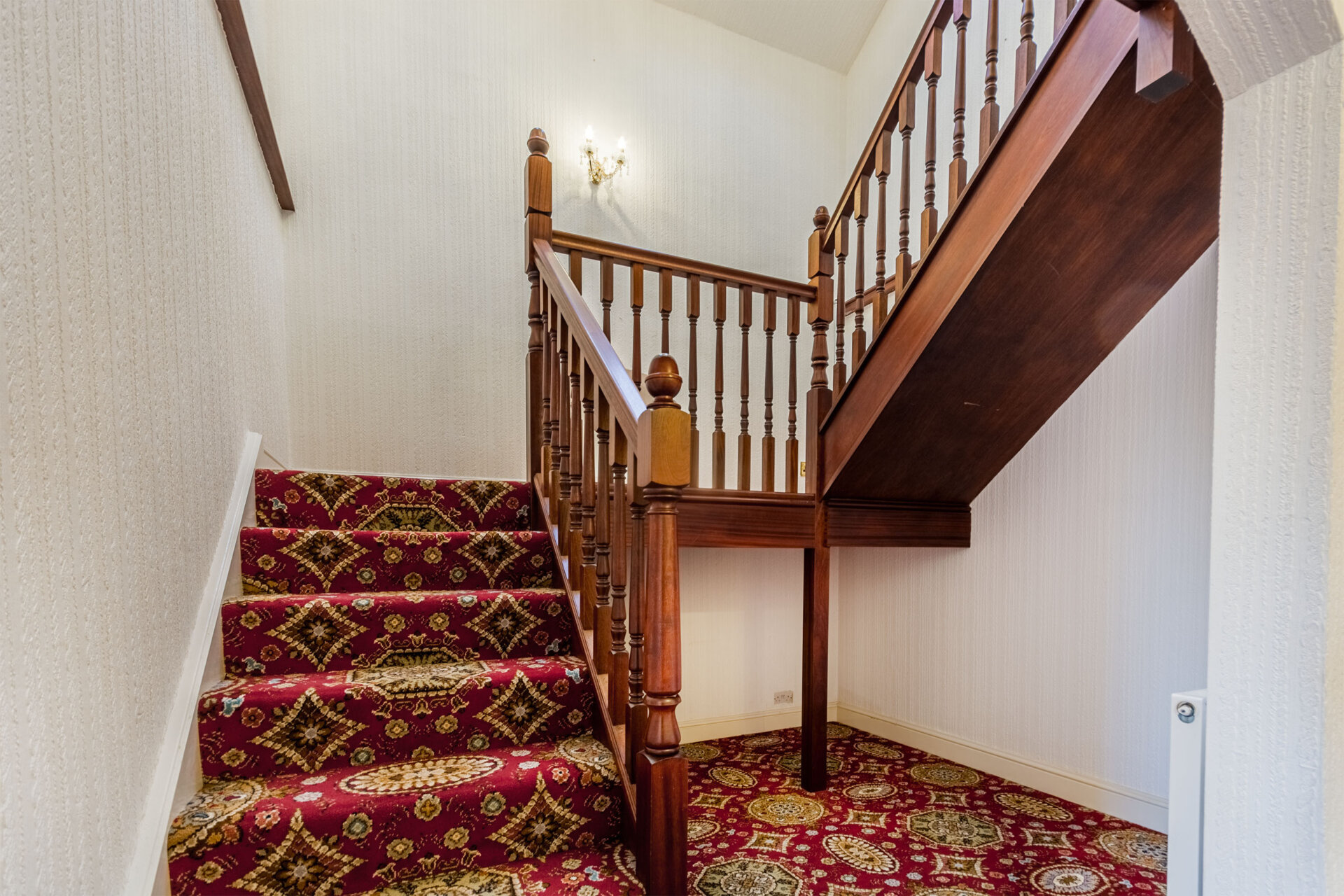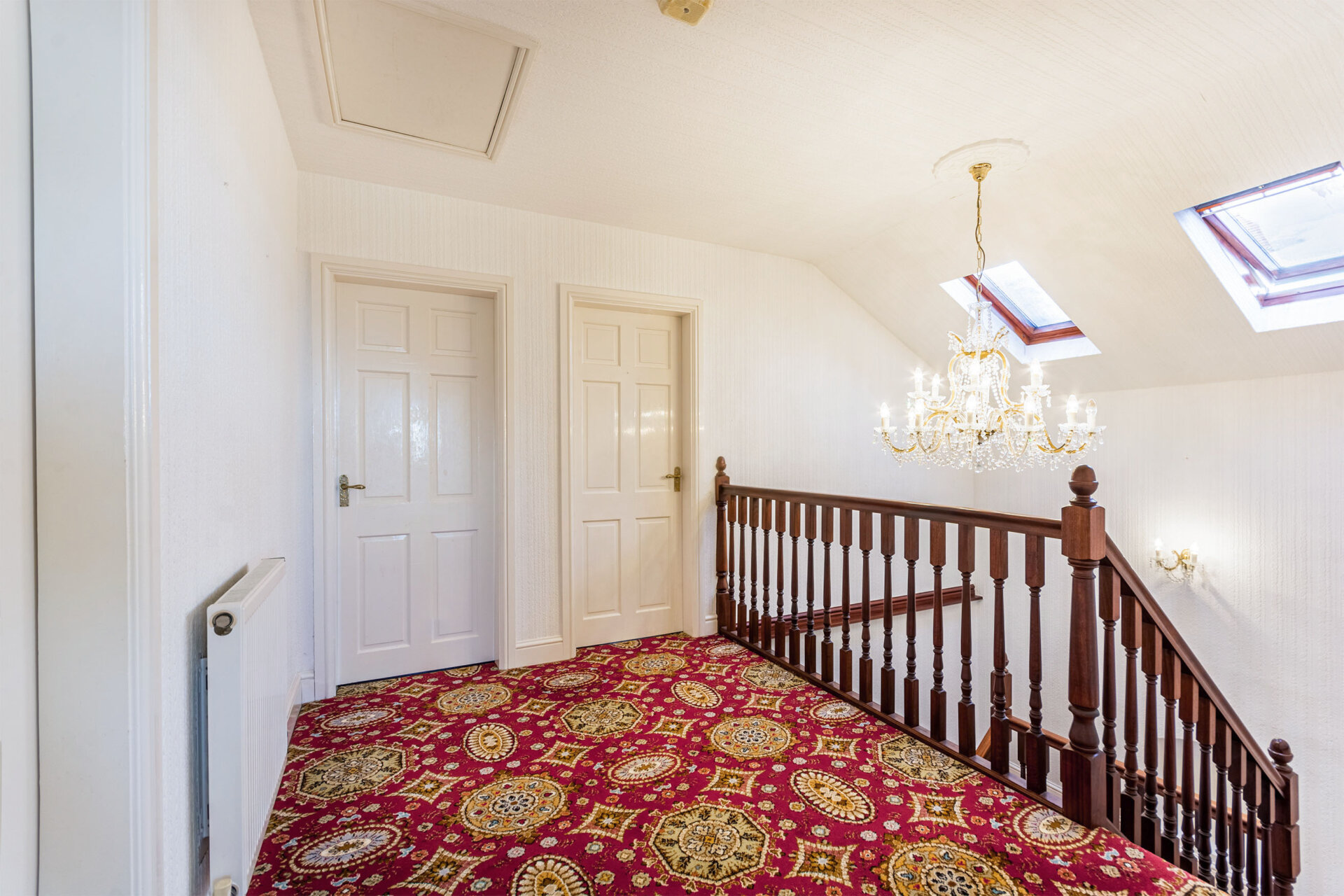 This incredible winding staircase with galleried landing is the perfect centre piece to this family home. Vaulted ceiling with two 'Velux' windows carpet to both the stairs and landing with balustrade, radiator and doors to;