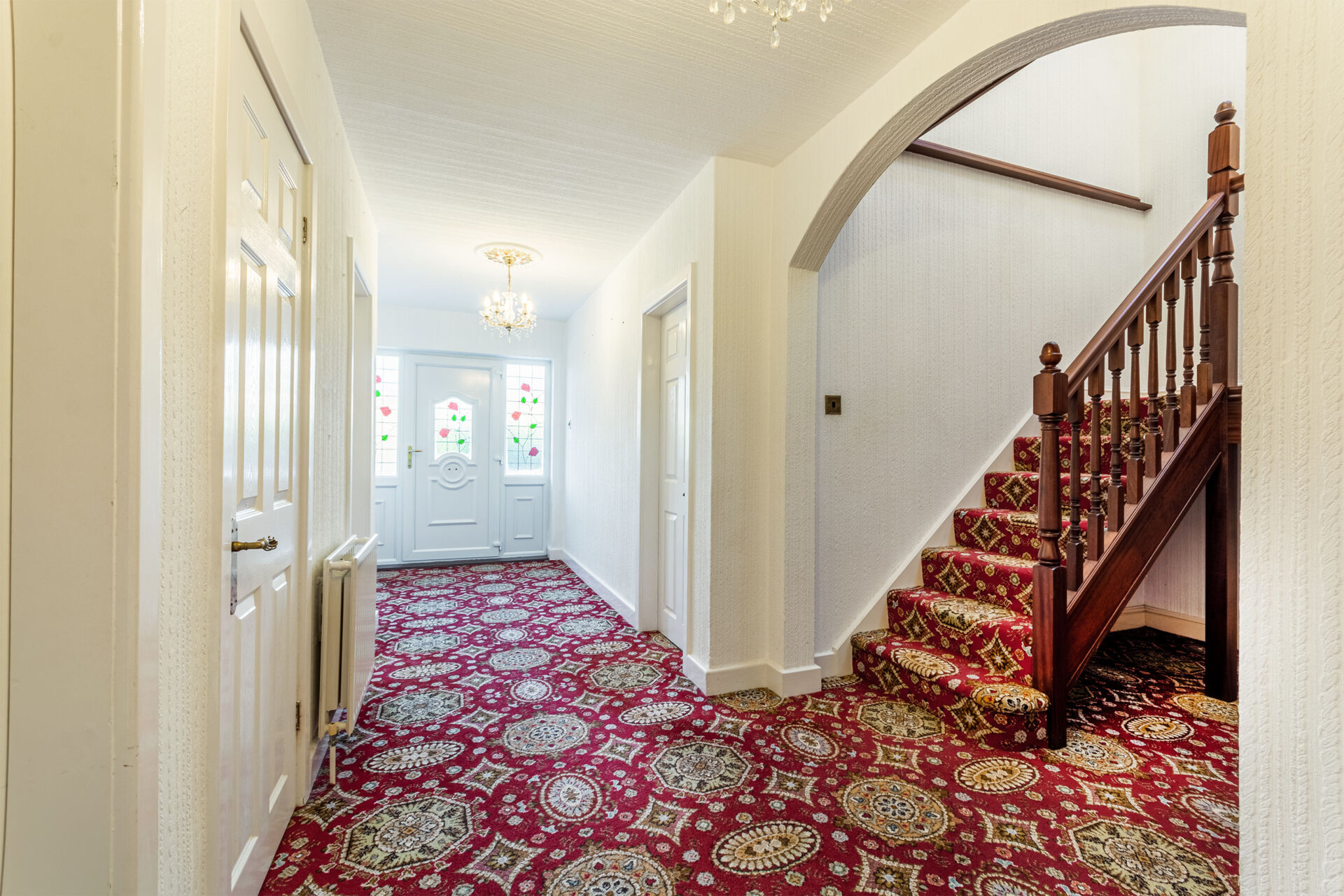 Double glazed door to enter with double glazed windows to both sides, large hallway with carpet flooring, radiator, cupboard for cloaks, alarm system, beautiful winding staircase as a centre piece to this spacious family home and doors to;