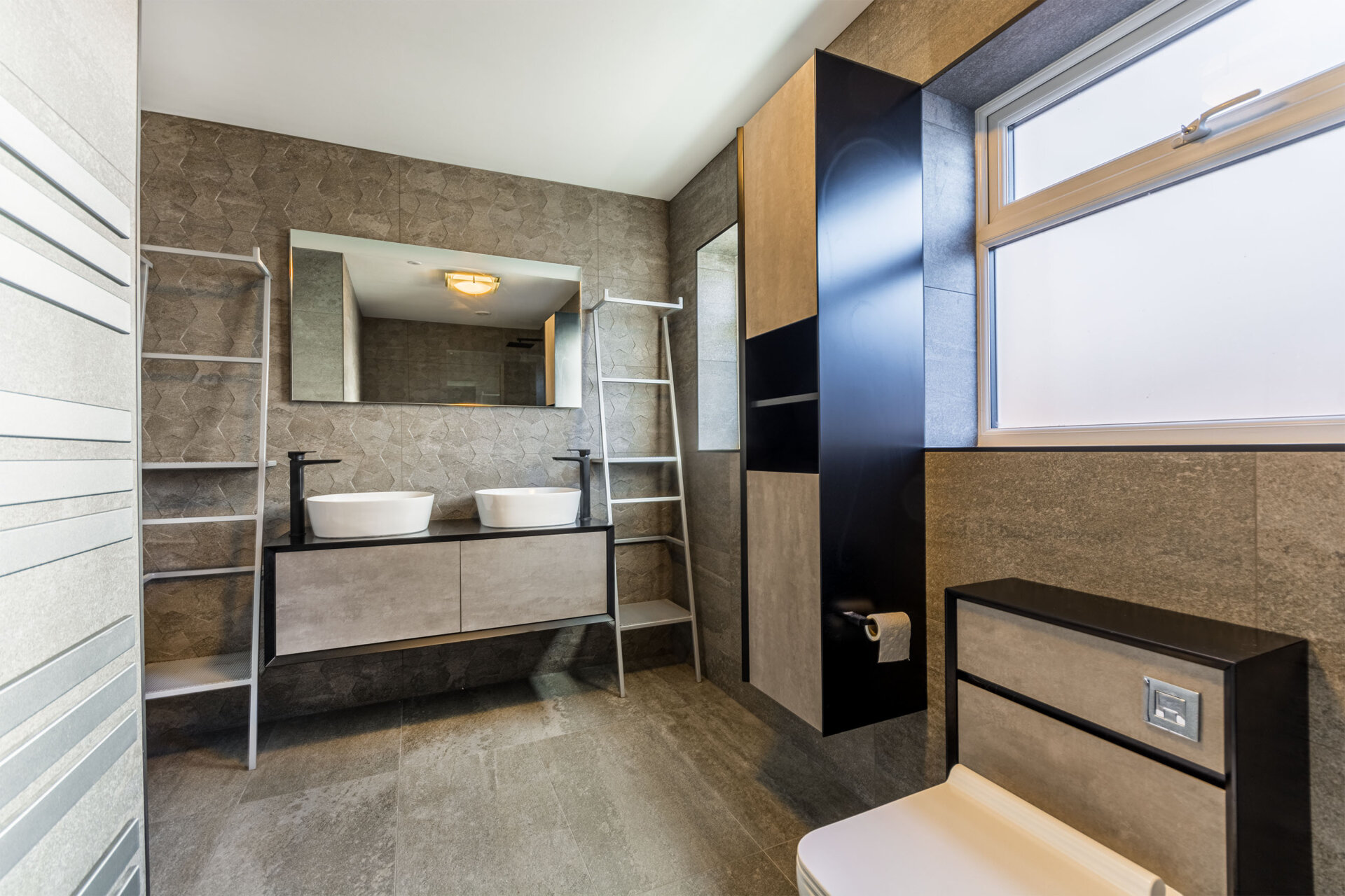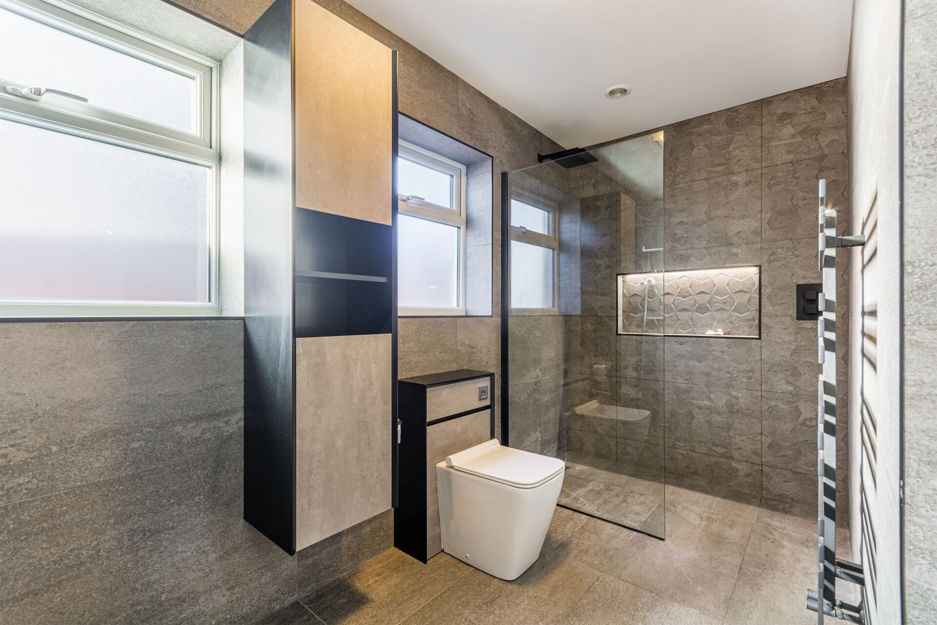 A refitted shower suite comprising of a walk in double shower with waterfall shower over, under floor heating, glass privacy screen, tiled walls and floors, low flush wc, fitted cupboard, floating vanity unit with fitted his and her wash hand basins, two opaque double glazed windows to the right elevation and ladder style radiator.