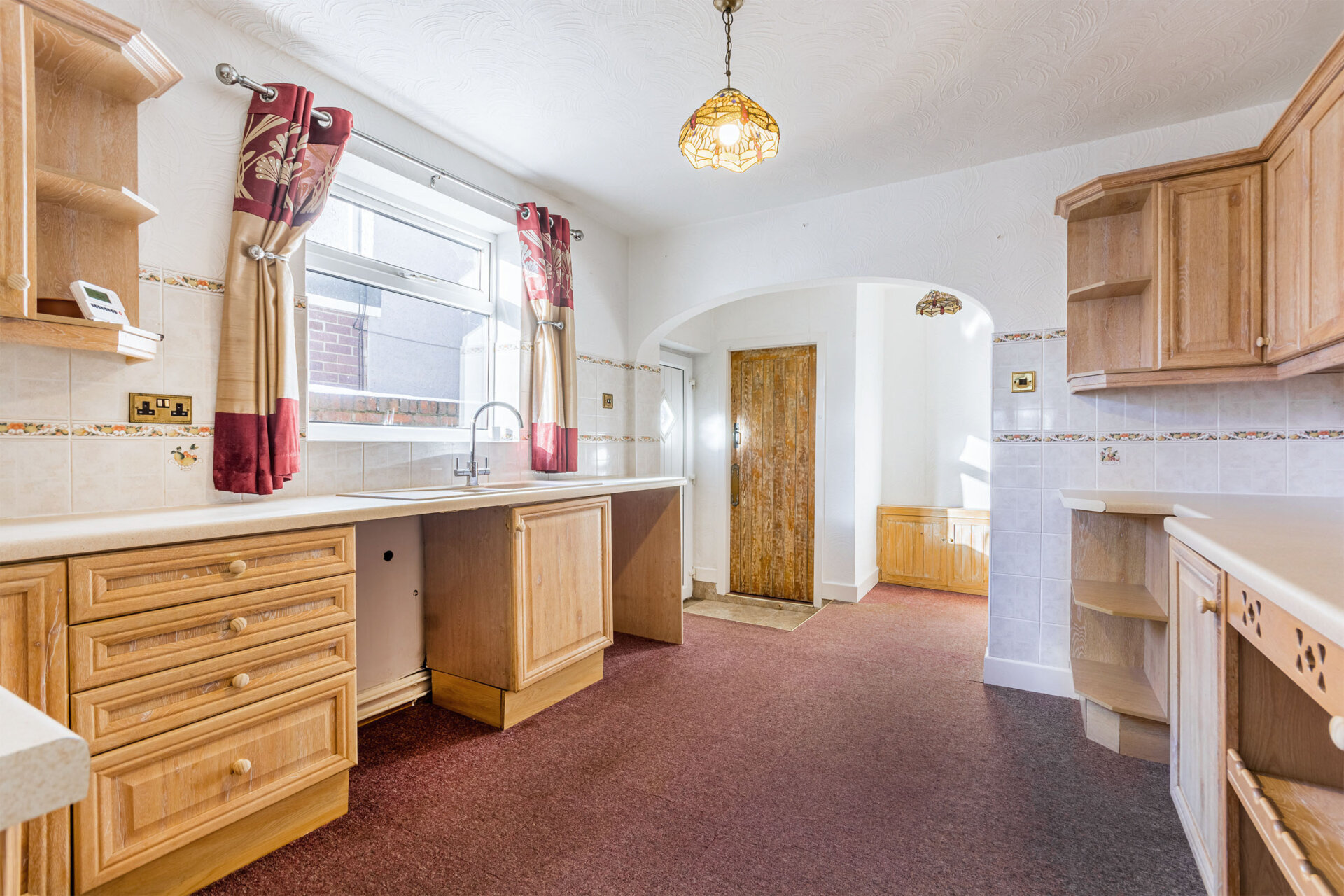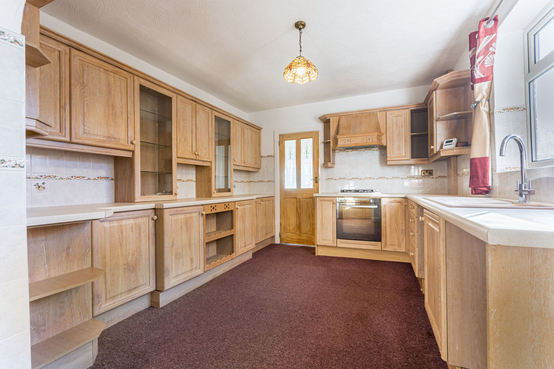 A range of wall and base units with round top work surfaces , one and a half bowl sink and drainer with mixer tap over, tiled splash backs, integrated electric oven and gas hobs, space for under counter fridge and freezer, radiator, double glazed window and door to the right elevation, pantry with space for washing machine, dryer and wall mounted combi boiler. Also housing the gas and co2 meter.