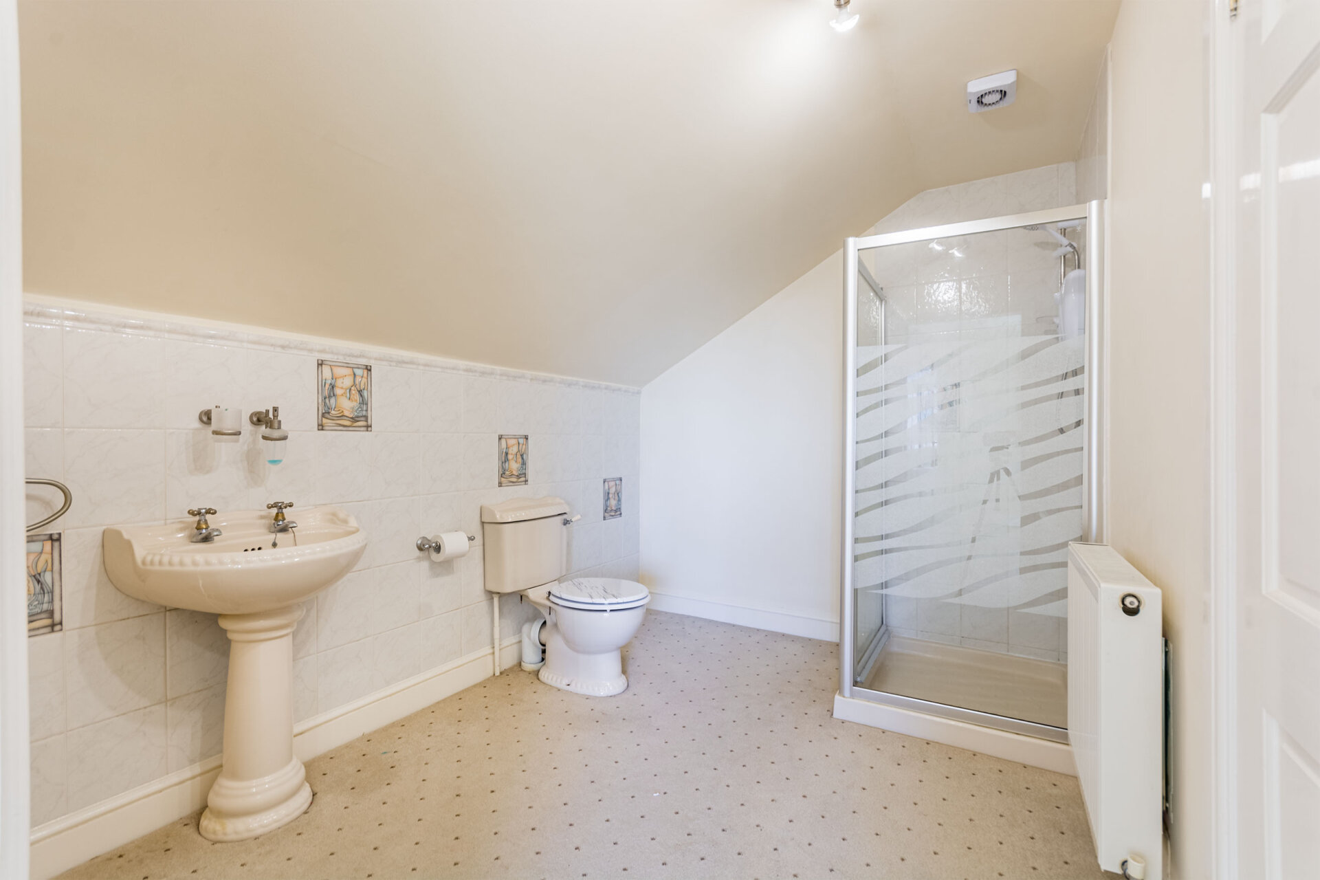 What a generous bathroom currently a shower room, but so much space for a four piece if needed. This suite comprises of a corner shower cubicle, low flush wc, pedestal wash hand basin, radiator.