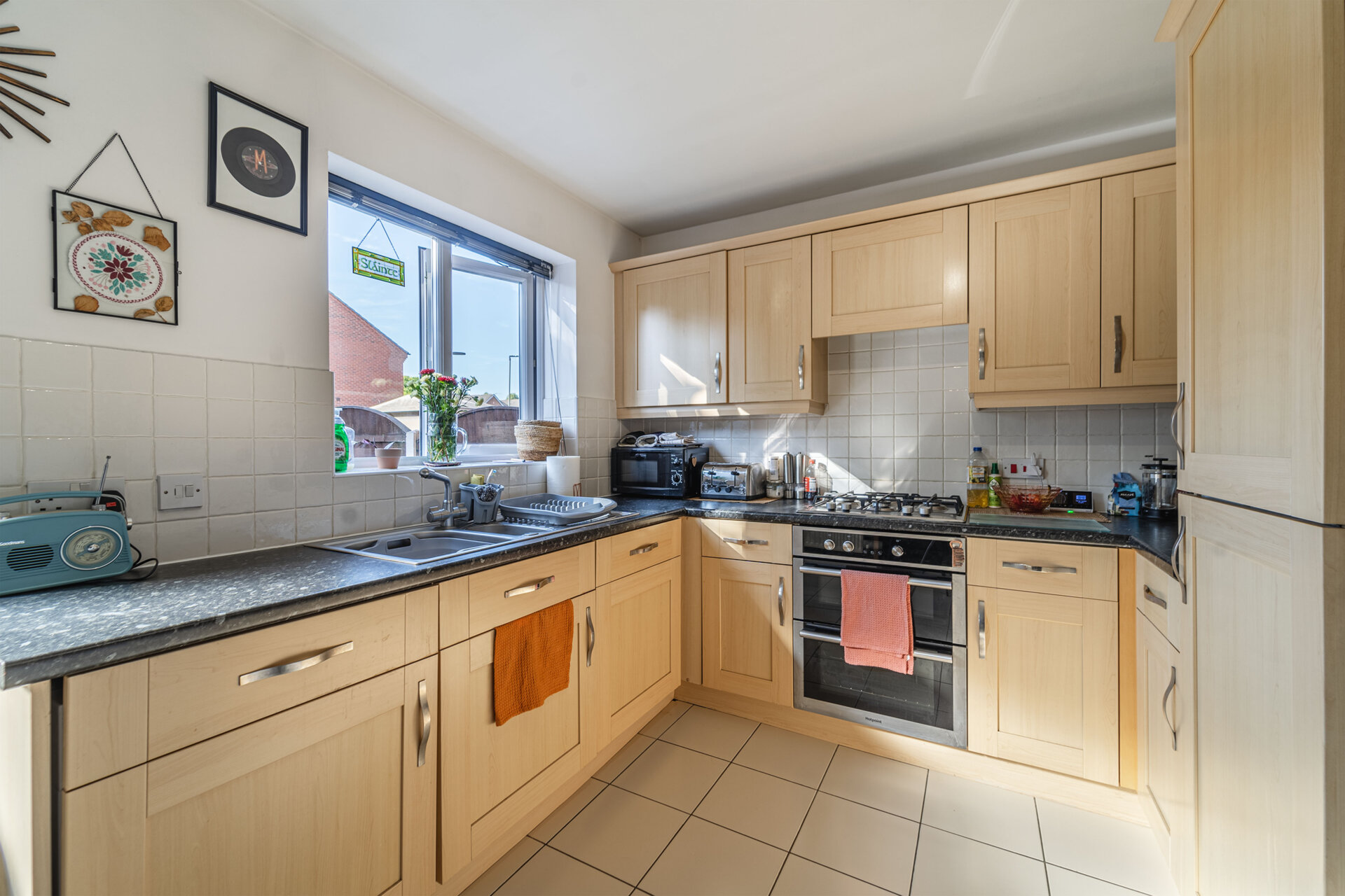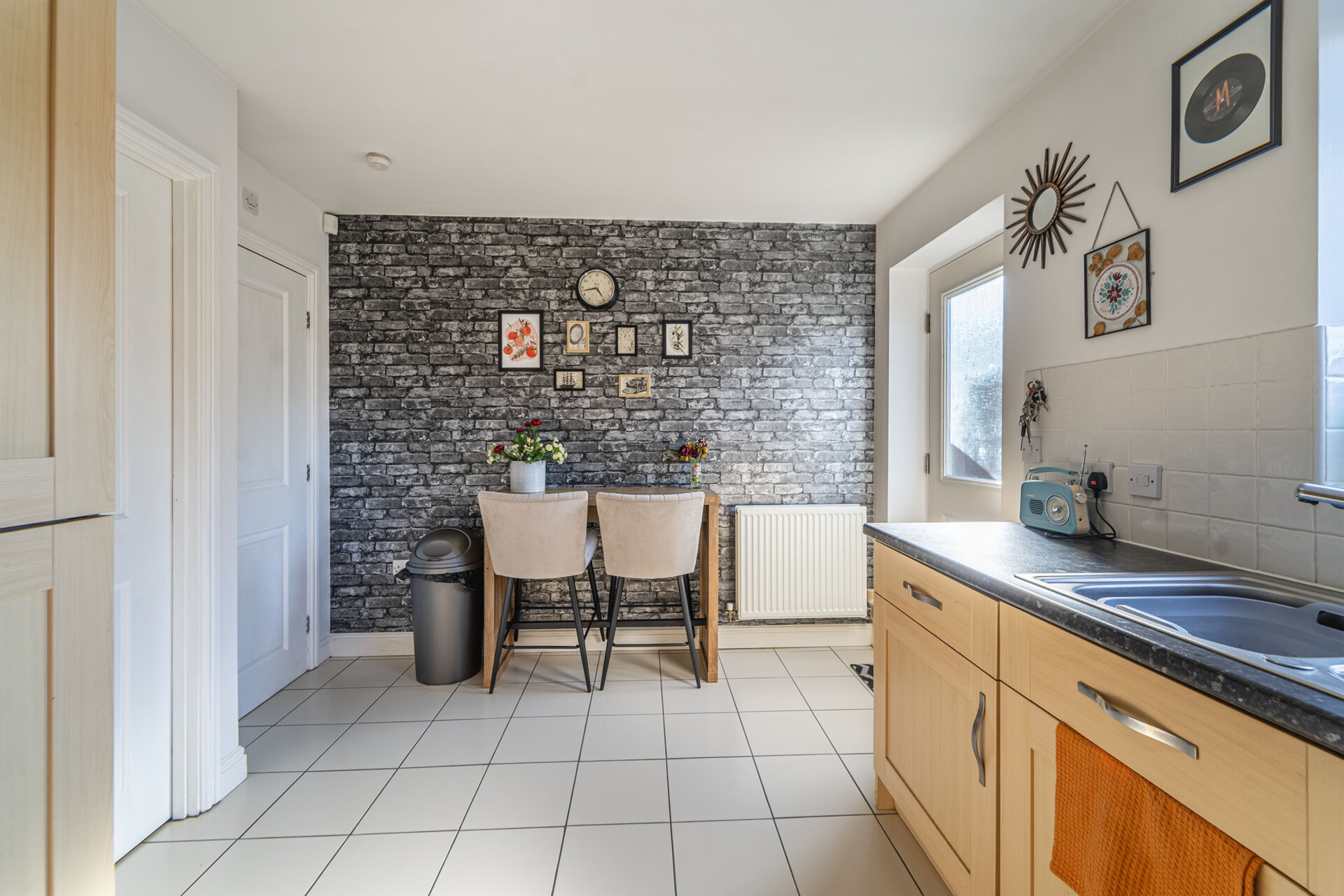 A bright and spacious kitchen diner, with a range of wall and base units with round top work surfaces with tiled splash backs, one and half bowl sink and drainer with mixer tap over, electric oven and grill with gas hobs, integrated fridge freezer, washing machine and dish washer, double glazed window to the rear, space for dining, tiled flooring, radiator, double glazed door to the rear.