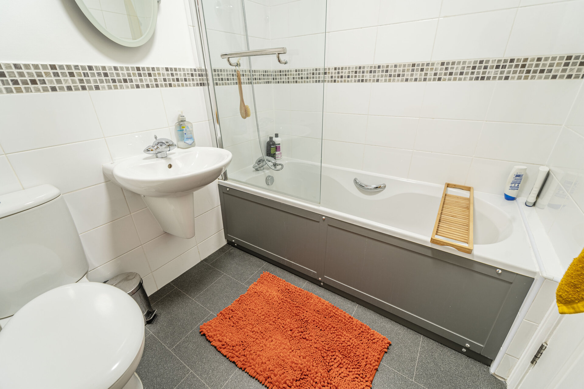 Family bathroom comprising of a three piece suite, panelled bath with shower over, glass privacy screen, low flush wc, wash hand basin, radiator and tiled walls.