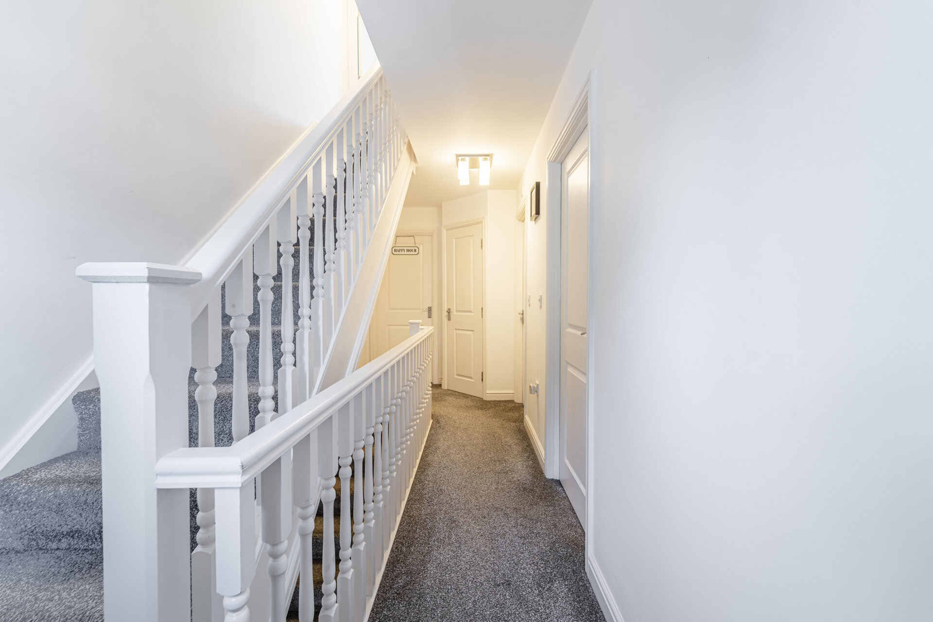 First floor landing with carpet to both the stairs and landing, cupboard for storage, double glazed window to the front elevation.