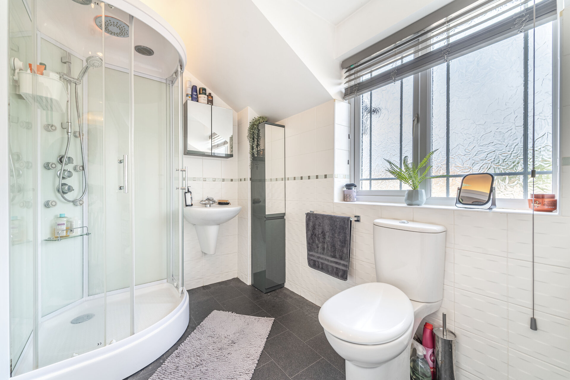 This generous ensuite comprises of a corner shower cubicle with jet shower, floating wash hand basin, low flush wc, tiled walls, radiator, double glazed window to the front and cupboard for storage.