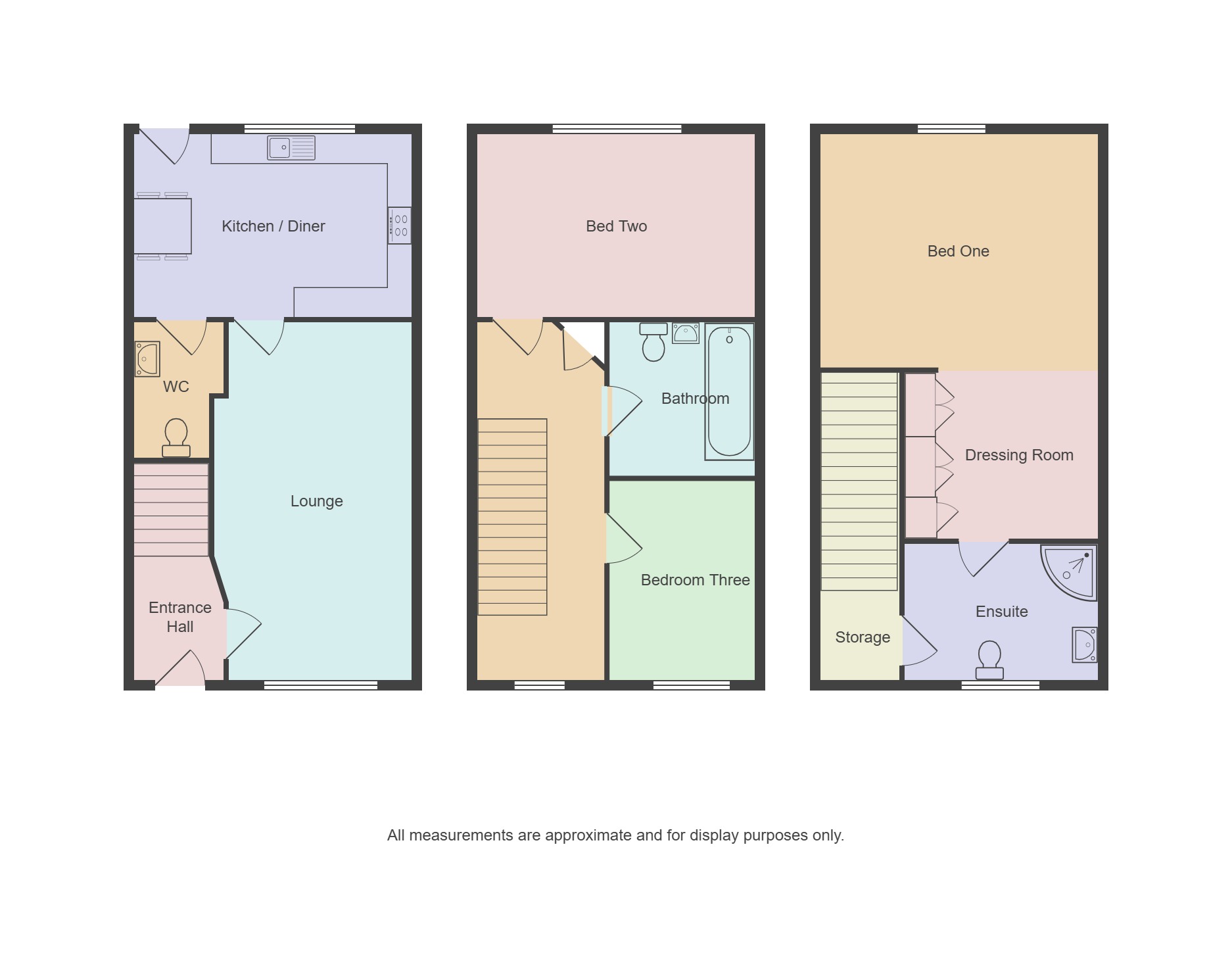 This home in brief comprises of entrance hallway, lounge, kitchen diner, cloaks/wc, stairs and landing to first floor, two bedrooms and family bathroom, stairs ascending to second floor with generous principle suite with dressing room and ensuite. Front and rear gardens with driveway for two cars.