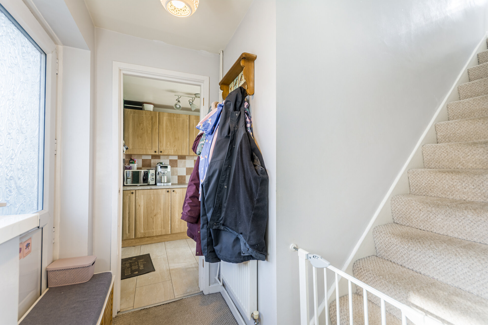 Double glazed door to enter into the entrance hall with carpet flooring, double glazed window to the right of the door, cloaks area, radiator, stairs ascending and doors to.