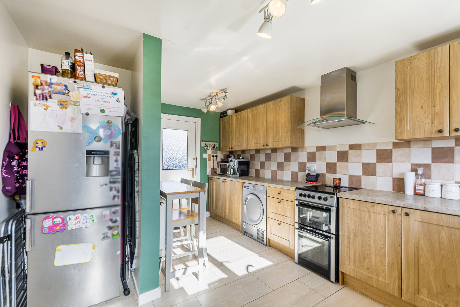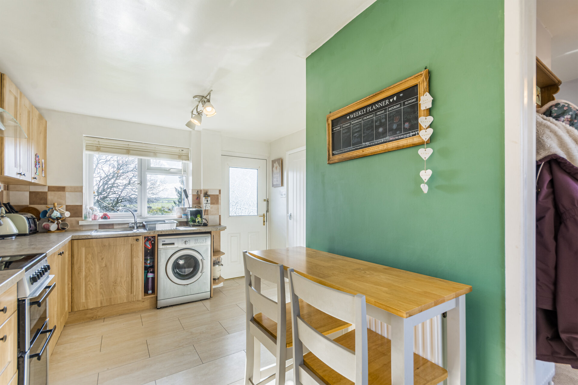 A range of wall and base units, roll top work surfaces, tiled splashbacks, sink and drainer with mixer tap, space for dryer and washing machine, electric oven and electric hobs with extractor fan, space for fridge freezer, Tiled flooring, composite door to front elevation, double glazed window and double glazed composite door to rear, under stair storage, and a further door to covered space / utility. radiator and area for breakfast bar.