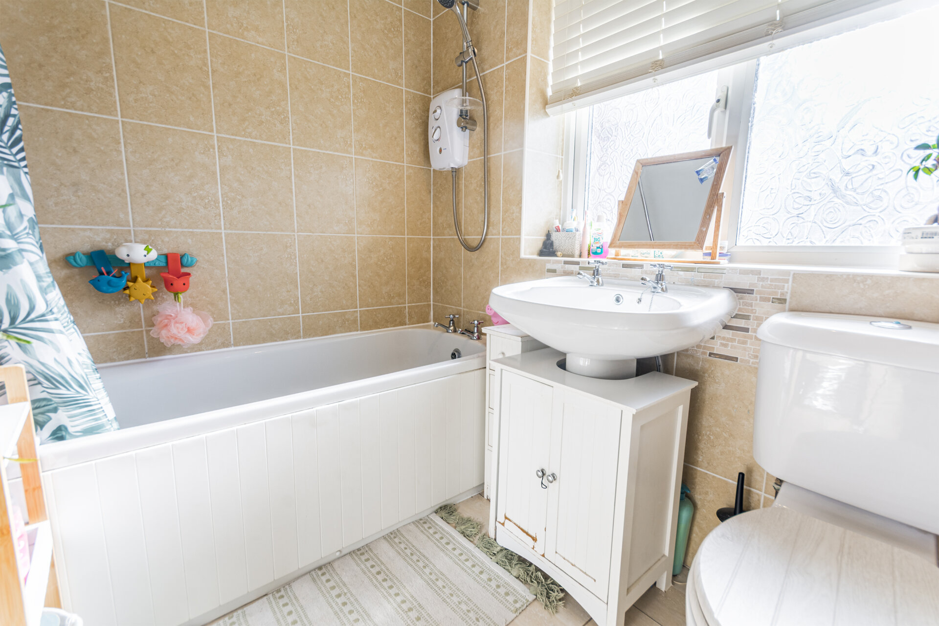Bathroom Comprising three-piece white suite, Panel bath with electric shower over, tiled walls, pedestal wash hand basin, low flush WC, ladder style radiator.