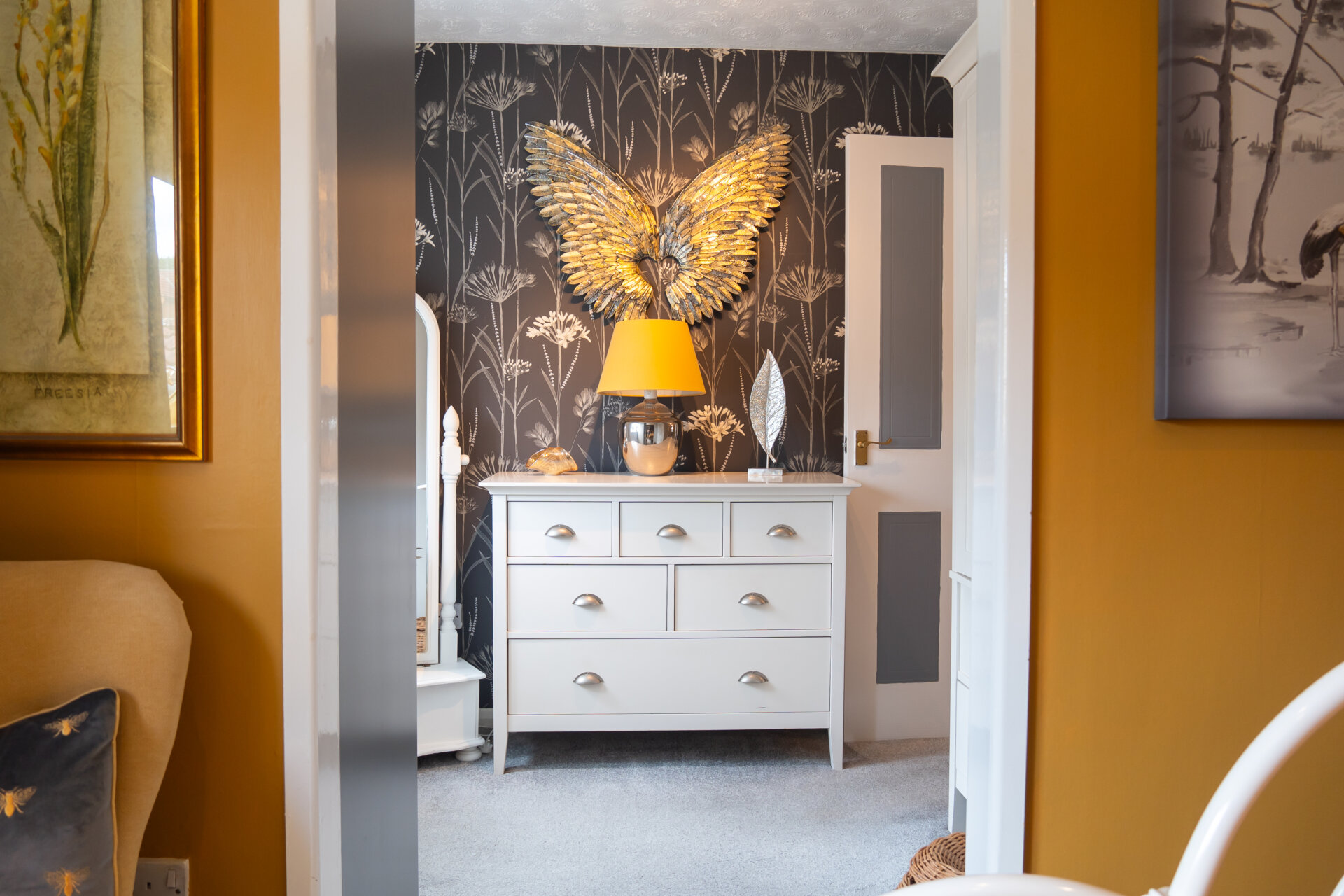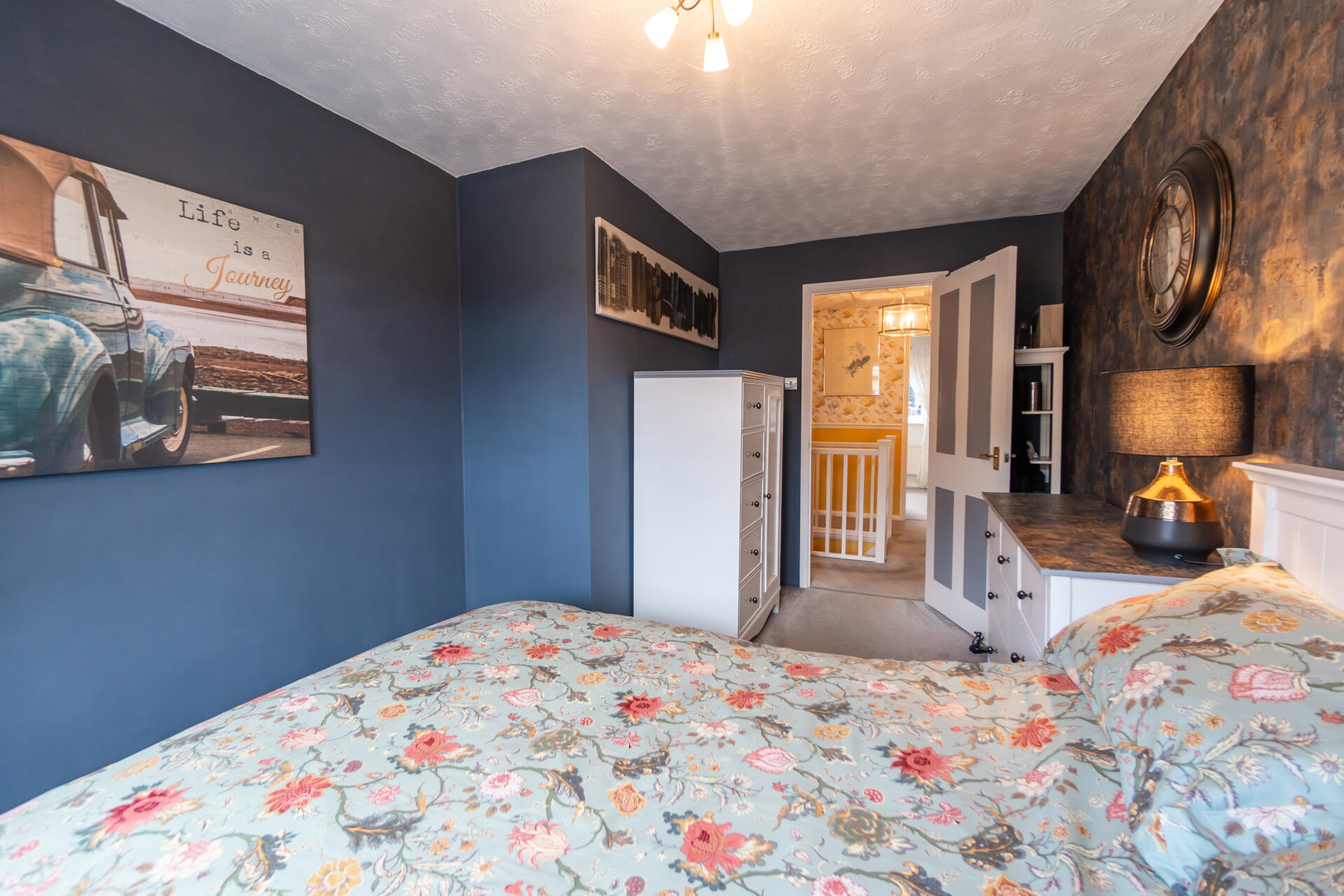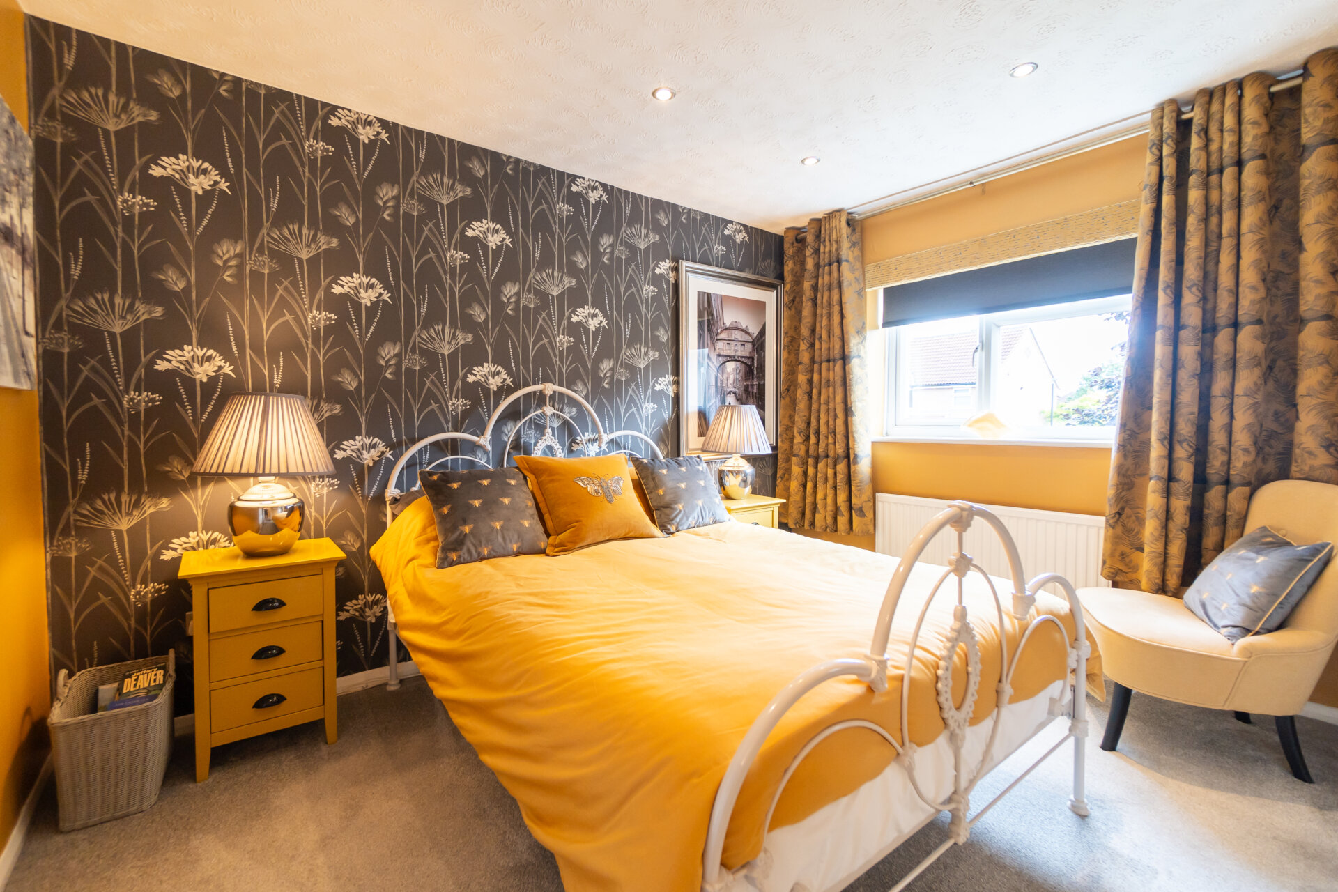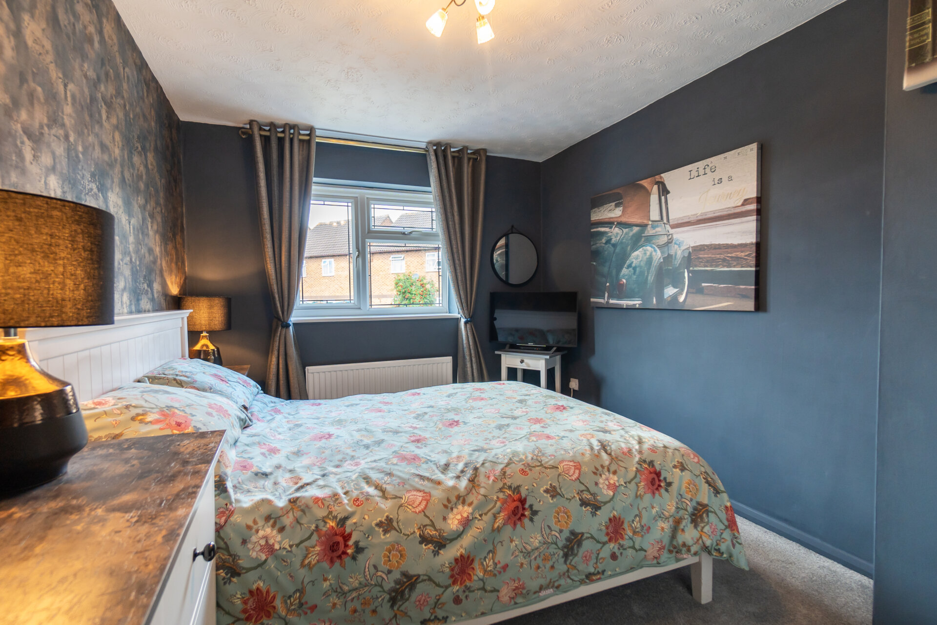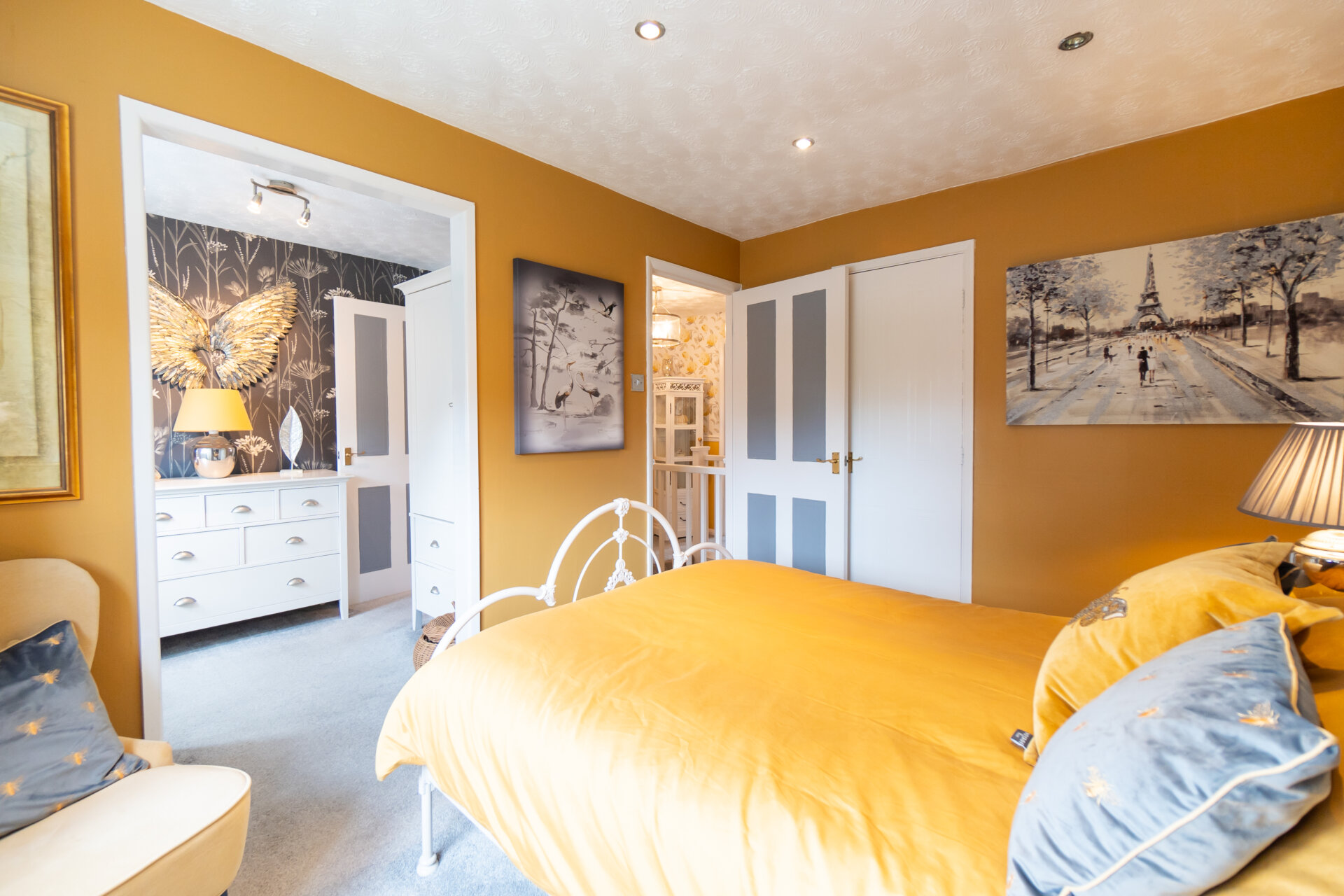 A beautifully decorated main bedroom with cupboard for wardrobe or storage, double glazed window to the rear, carpet flooring and radiator.