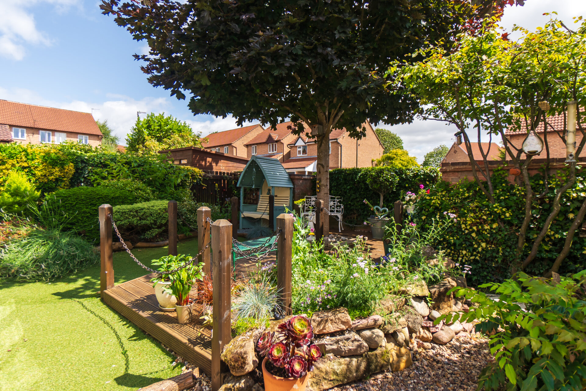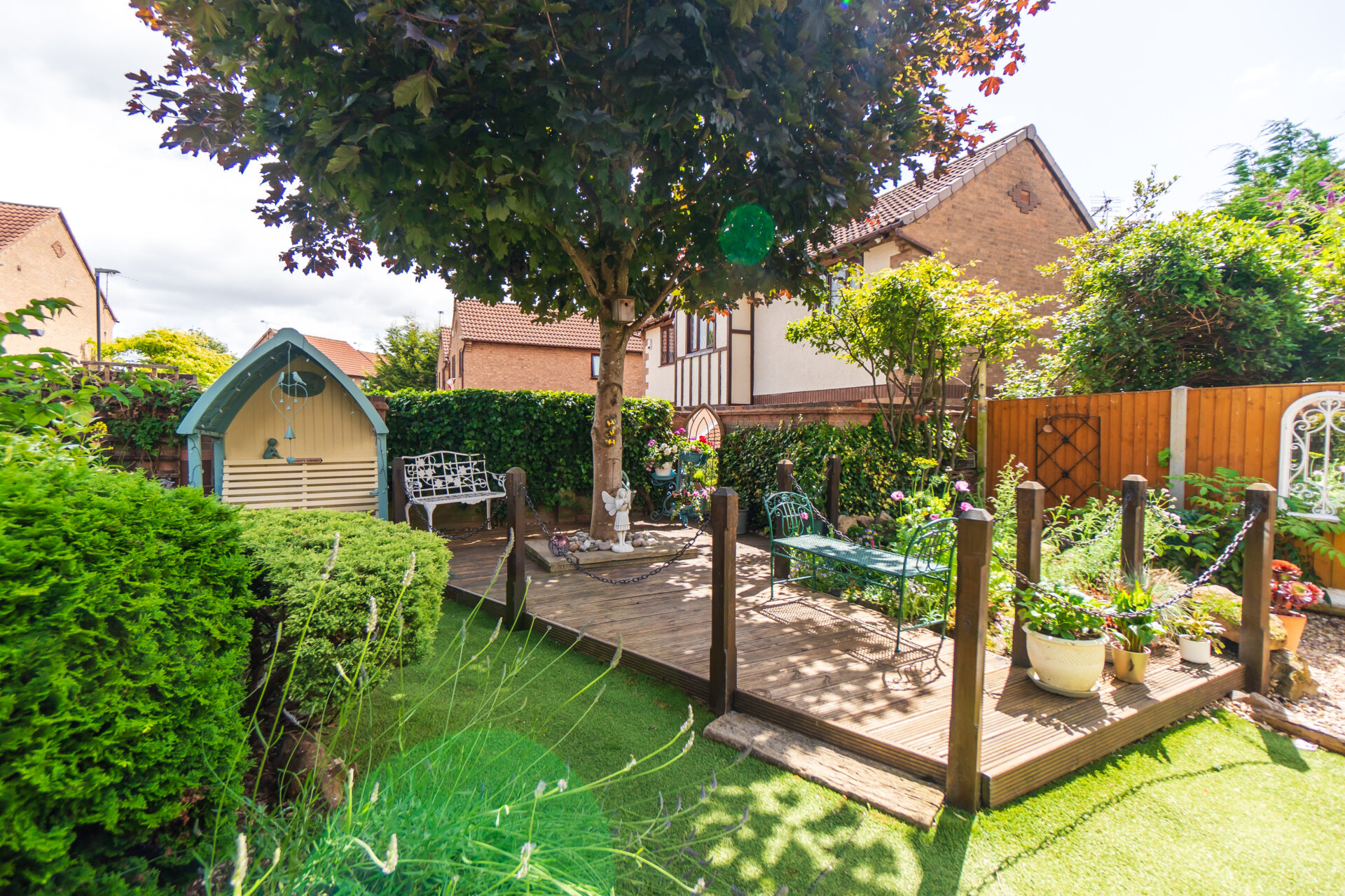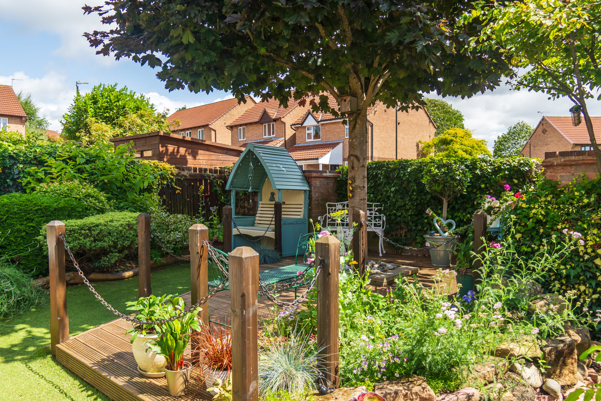 Stepping outside, the property reveals a well-established and beautifully landscaped garden to the rear, providing a peaceful retreat for residents to unwind and enjoy nature. The garden features an array of colourful flowers and shrubbery, along with a decked area and a patio perfect for outdoor seating, all enclosed within walls and fencing to ensure privacy. To the front, there is a driveway offering parking space for two vehicles, leading to a single garage equipped with power and electric, ideal for storage or parking. The front garden is equally charming with great kerb appeal, with well-maintained flower beds and shrubbery, complemented by steps leading up to the welcoming front door. This property truly combines modern comfort with outdoor serenity, offering a complete package for those seeking a harmonious lifestyle in a desirable village setting.