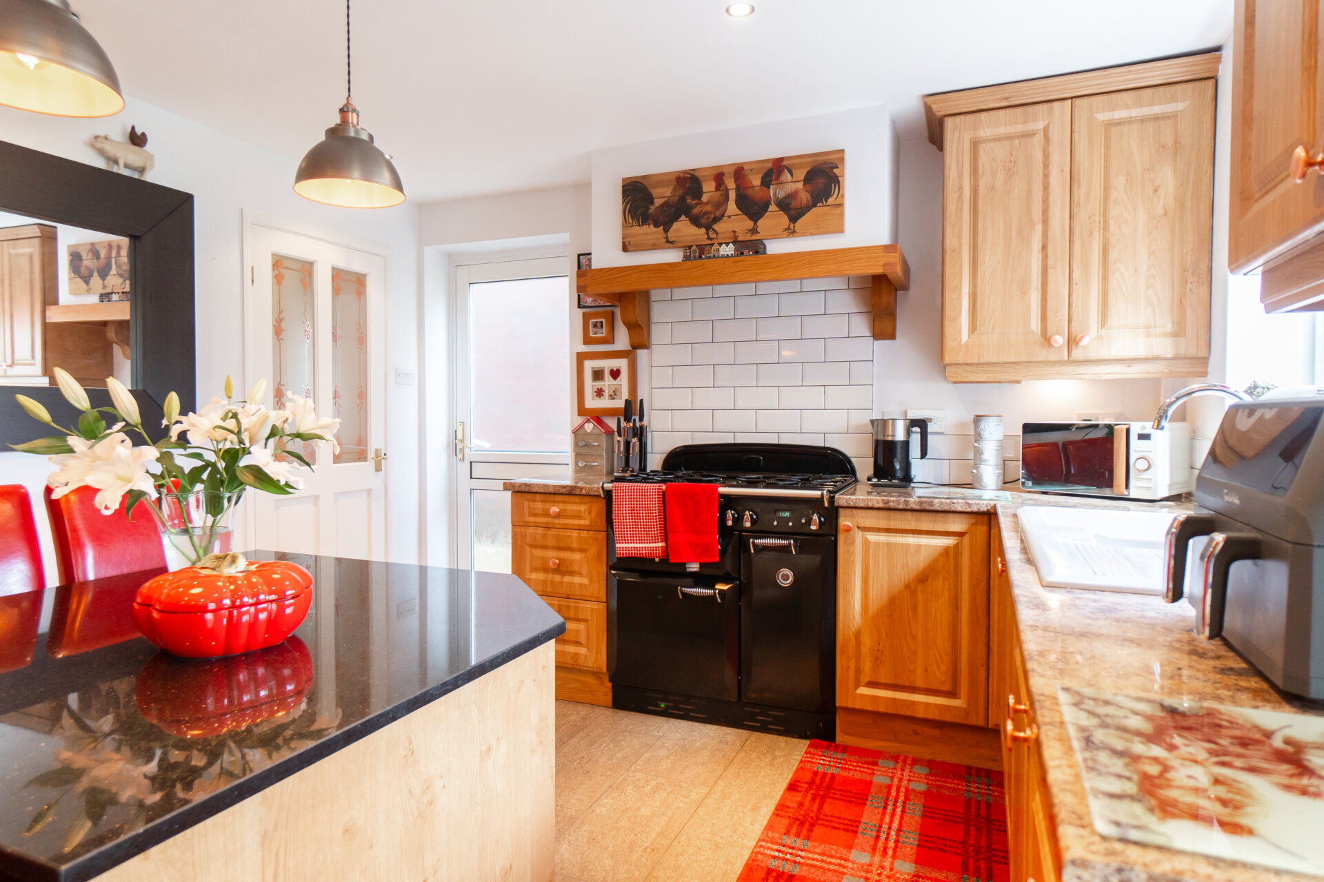 A gorgeous breakfast kitchen with a wide range of wall and base units with round top work surfaces, tiled splash backs, one and a half bowl sink and drainer with mixer tap, integrated fridge freezer, dishwasher, washing machine, stunning 'Rangemaster' double oven with extractor hood, floor to ceiling cupboards and pantry cupboards, great use of space with under counter carousel units. Island with seating for four with matching under counter units and work surfaces, tiled flooring, underfloor heating, zone controller (no in use at the moment) double glazed window to the rear, double glazed door to the left elevation and double glazed french doors to the sun room.
