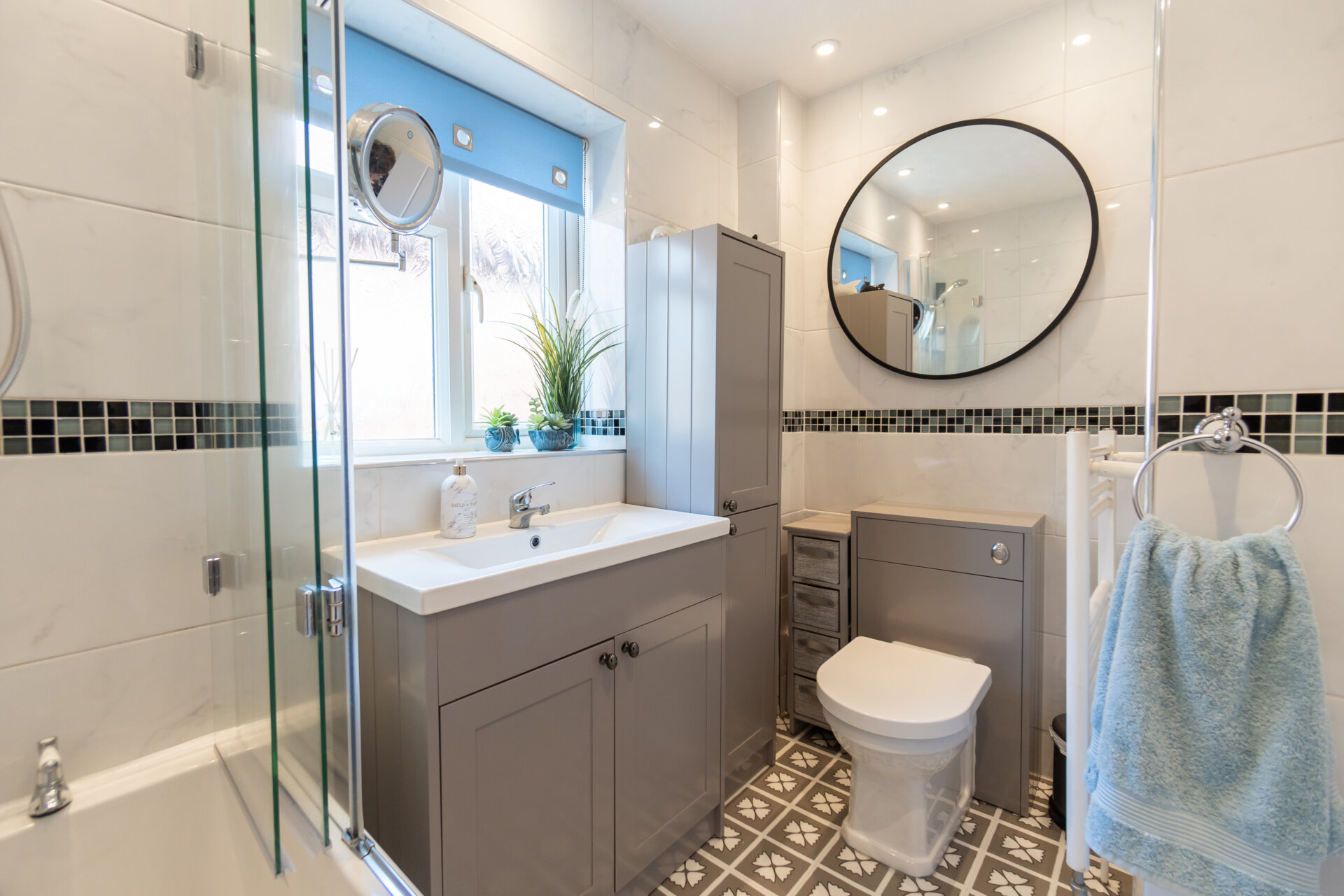 A stunning updated three piece bathroom suite comprising, panelled bath with electric shower over, glass privacy screen, vanity unit with wash hand basin, low flush wc, mosaic tile flooring, double glazed window and ladder style radiator.