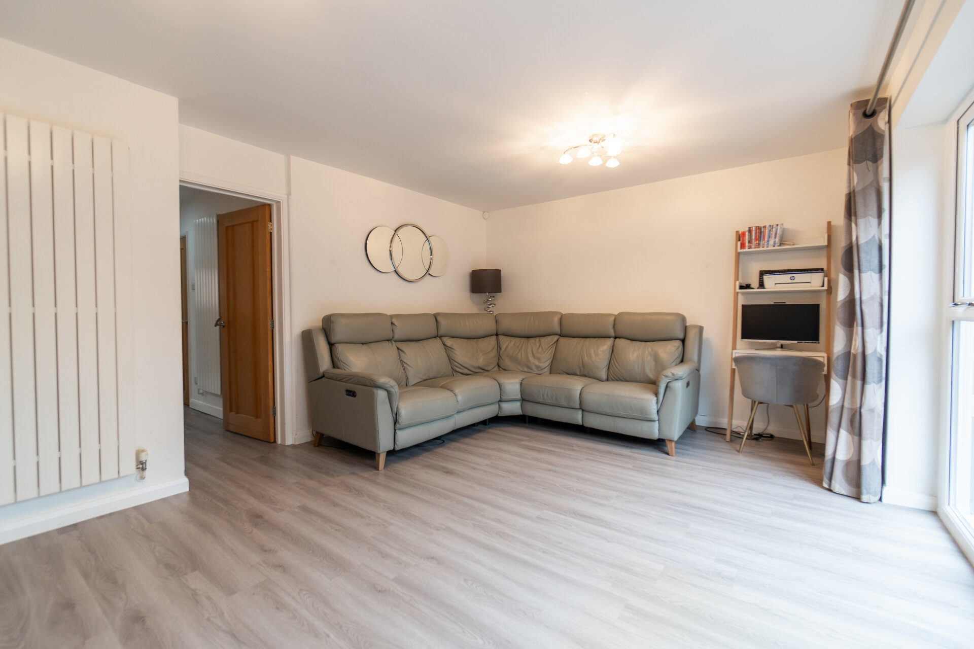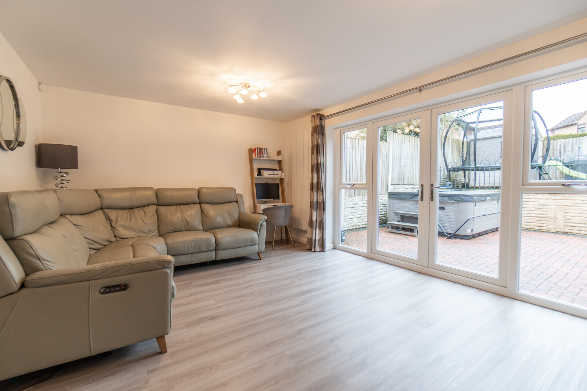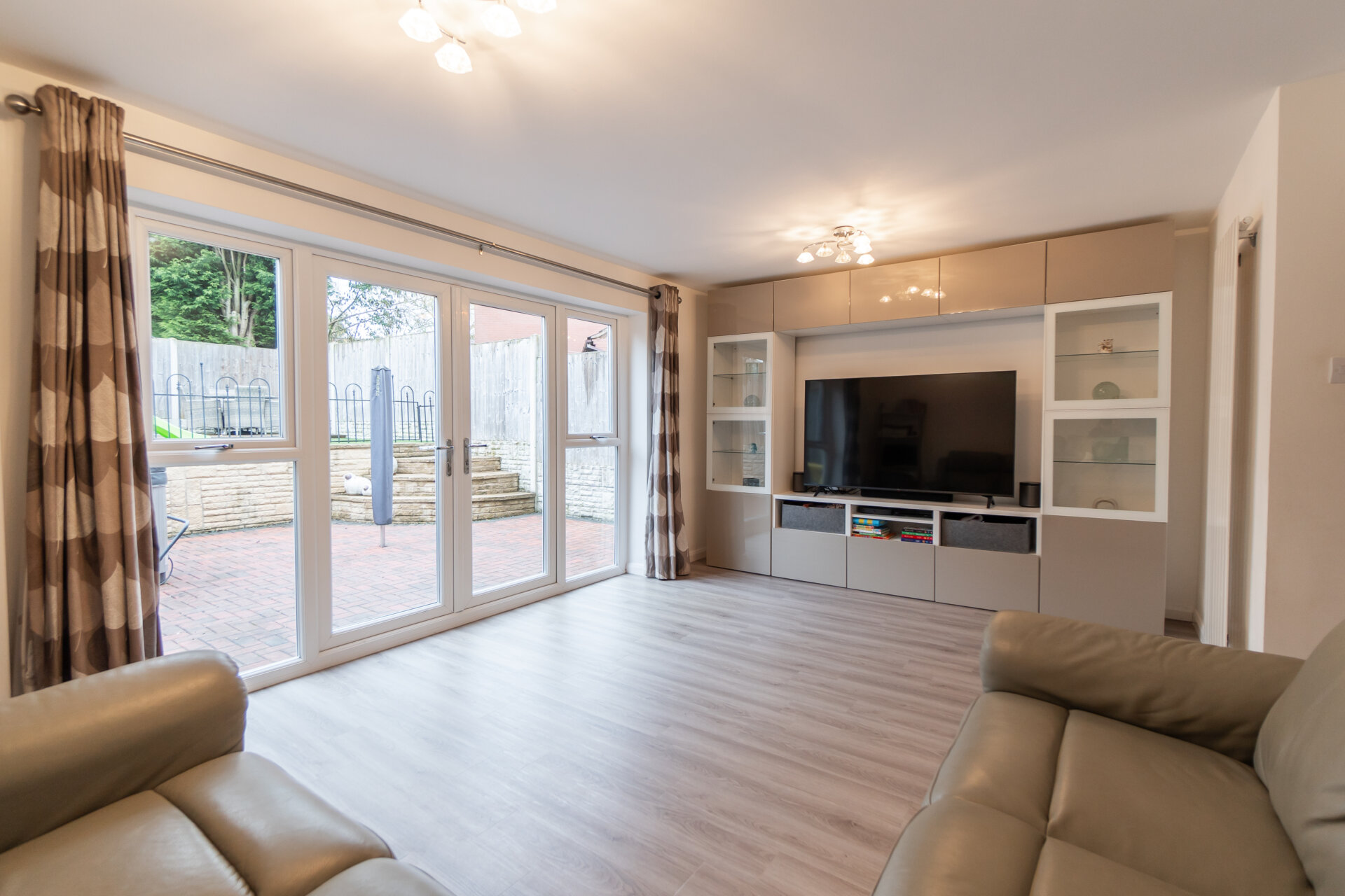 A bright and spacious lounge room with large double glazed patio doors to the rear with picture windows to either side giving this room plenty of natural light, laminate flooring, x2 vertical radiators.