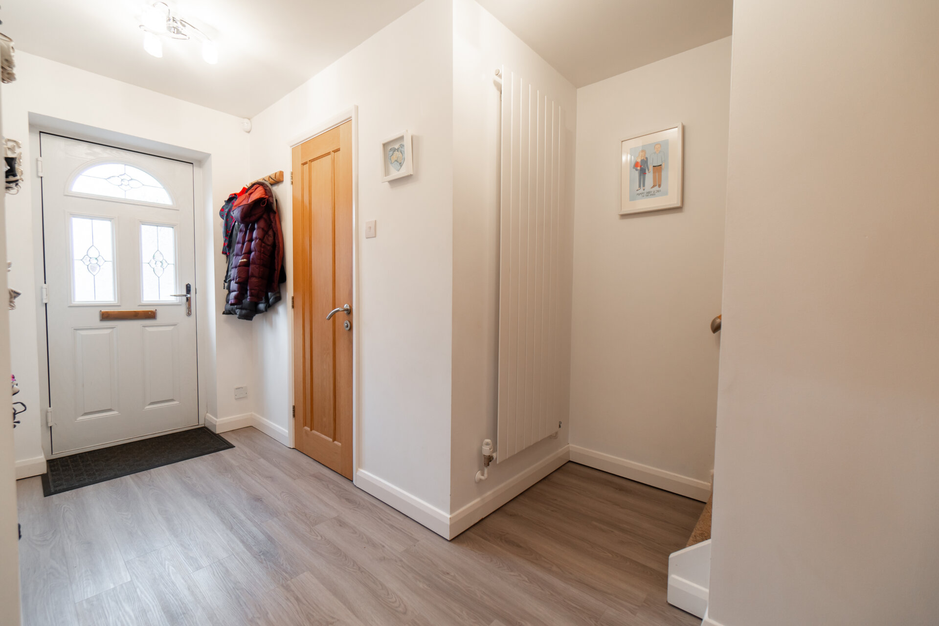 Spacious hallway with double glazed door to enter, laminate flooring, x2 vertical radiators, stairs ascending and doors to