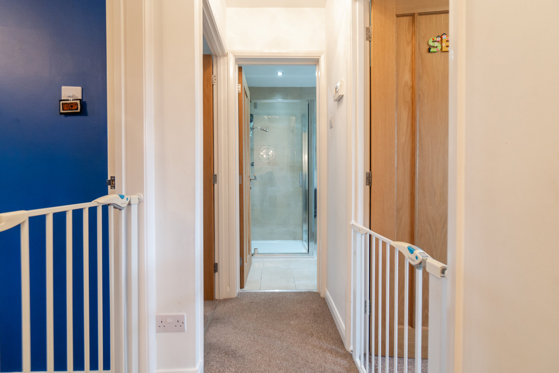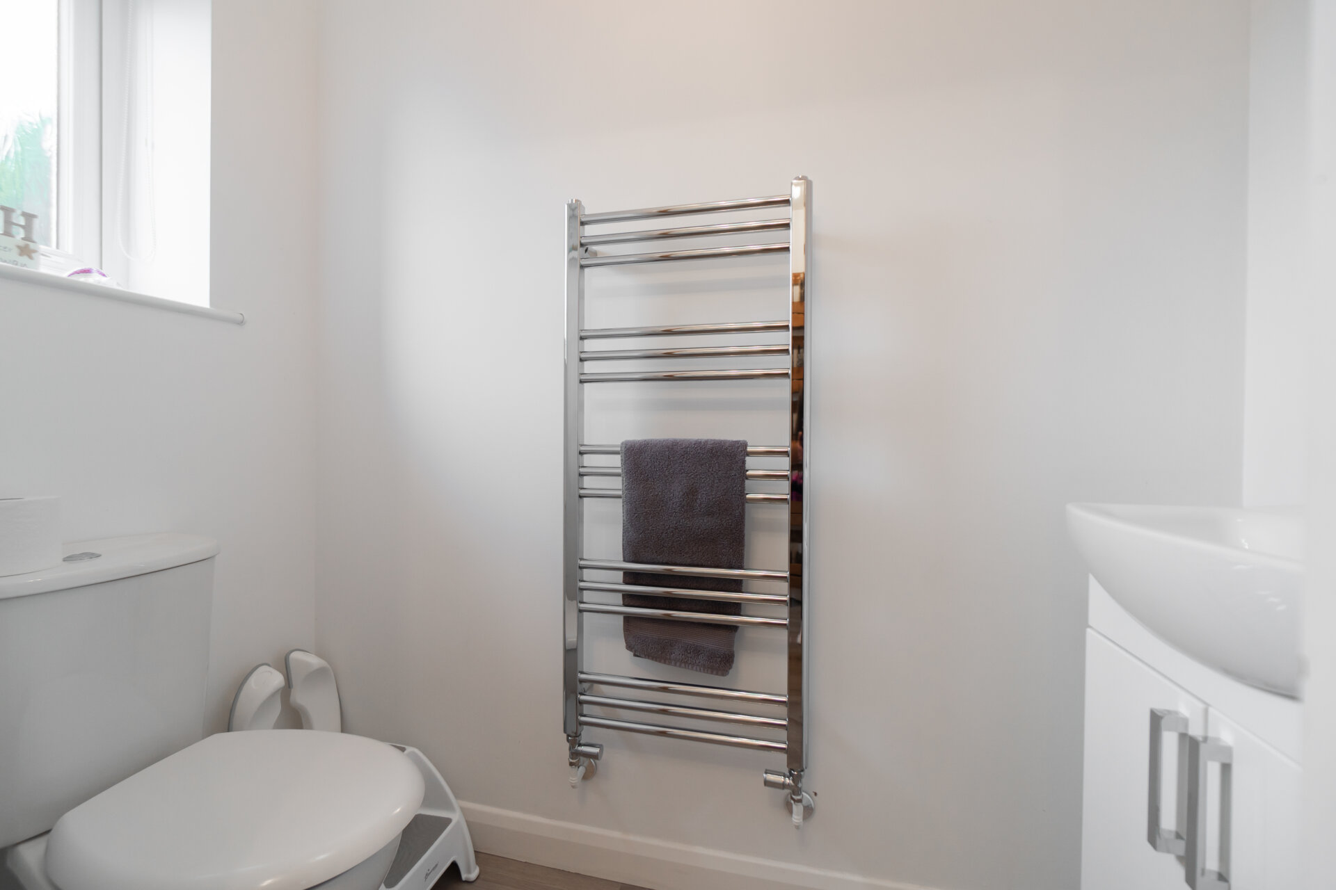 Continued laminate flooring, low flush wc, ladder style heated towel rail, vanity unit with inset wash hand basin, opaque double glazed window to the front elevation.
