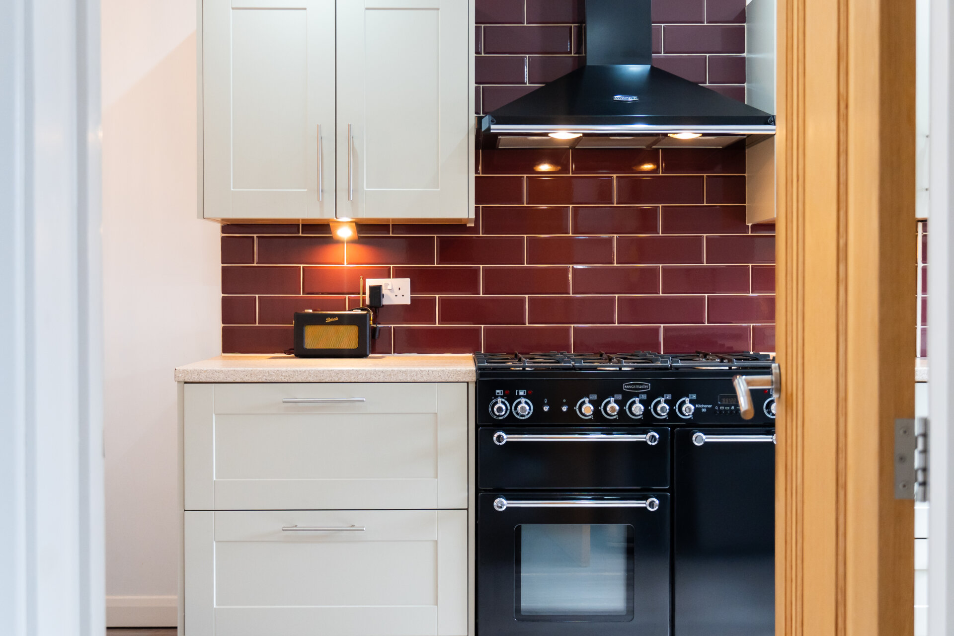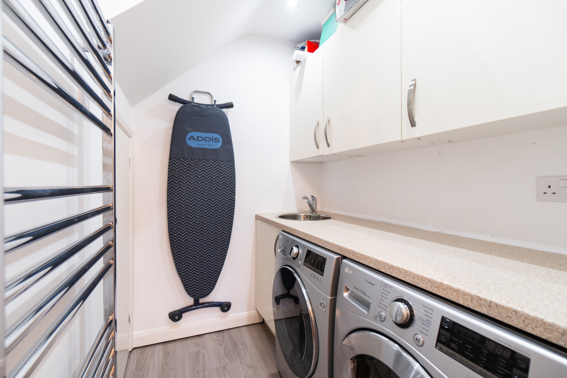 Wall and base units with roll top work surfaces, sink and drainer with mixer tap over, space for washing machine and dryer, ladder style heated radiator, under stair cupboard for storage.