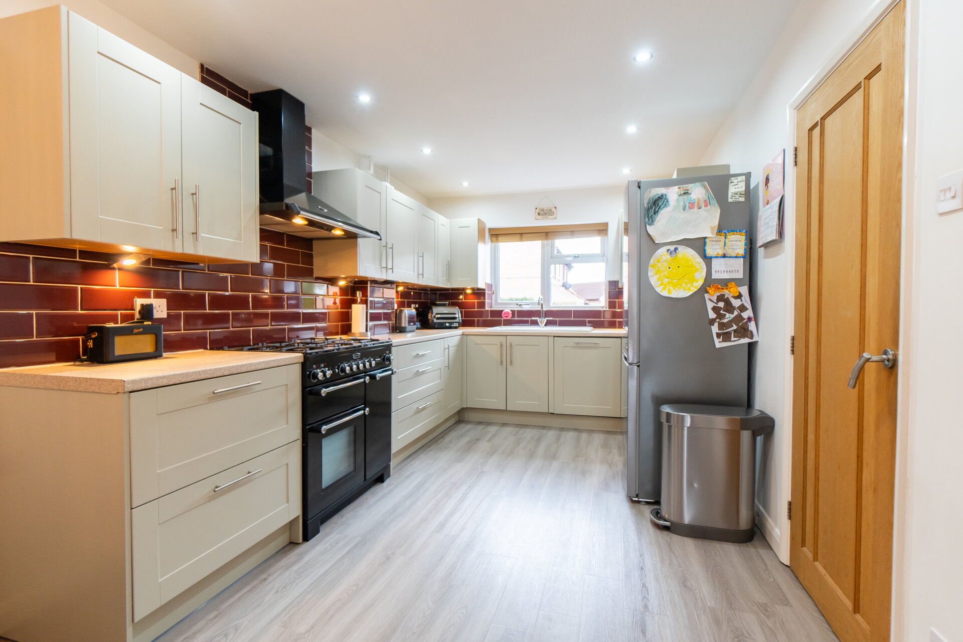 'Wow' what a fantastic room! A range of wall and base units with roll top work surfaces, tiled splash backs, integrated dishwasher, inset ceramic one and a half bowl sink and drainer with mixer tap over, space for fridge freezer, 'Rangemaster' cooker, with extractor hood, double glazed window to the front elevation. Area for dining with vertical radiator and spot down lights.