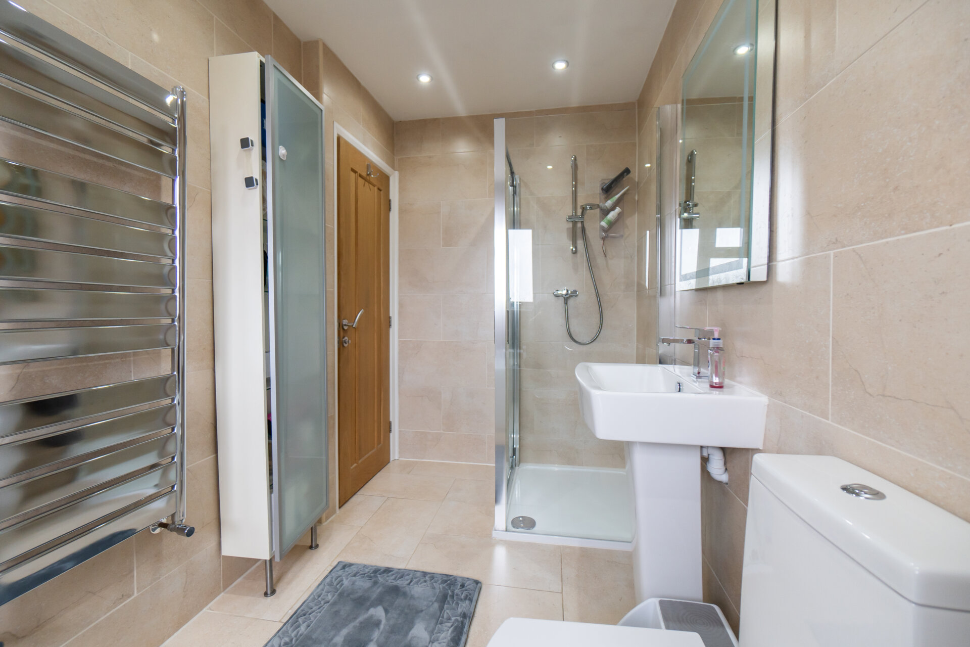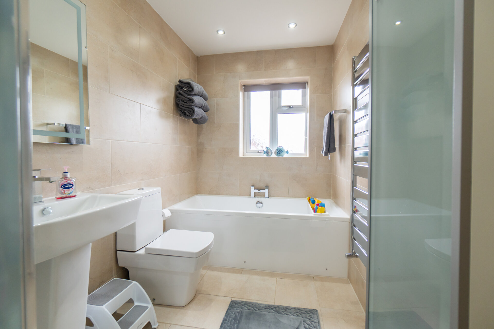 A white refitted four piece bathroom suite comprising a large walk in shower cubicle with a pump shower, pedestal wash hand basin, low flush wc, panelled bath with mixer taps over, tiled floors and walls, opaque double glazed window to the front, heated towel radiator & storage cupboard.