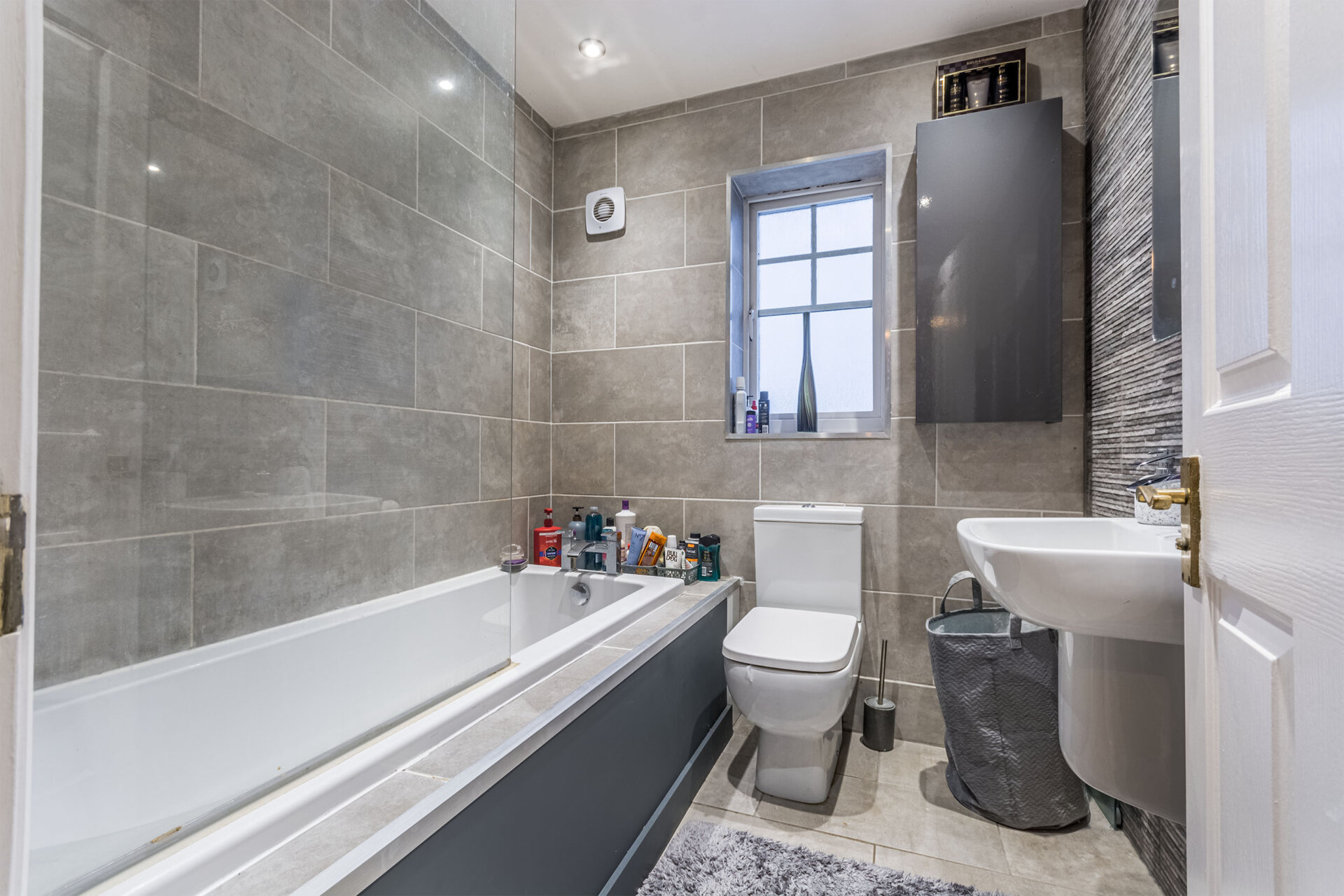 A white three piece suite comprising pedestal wash hand basin, low flush WC, tiled floor, bath with waterfall shower over & mixer, glass privacy screen, tiled walls, radiator, double glazed window to the rear and ladder style radiator.