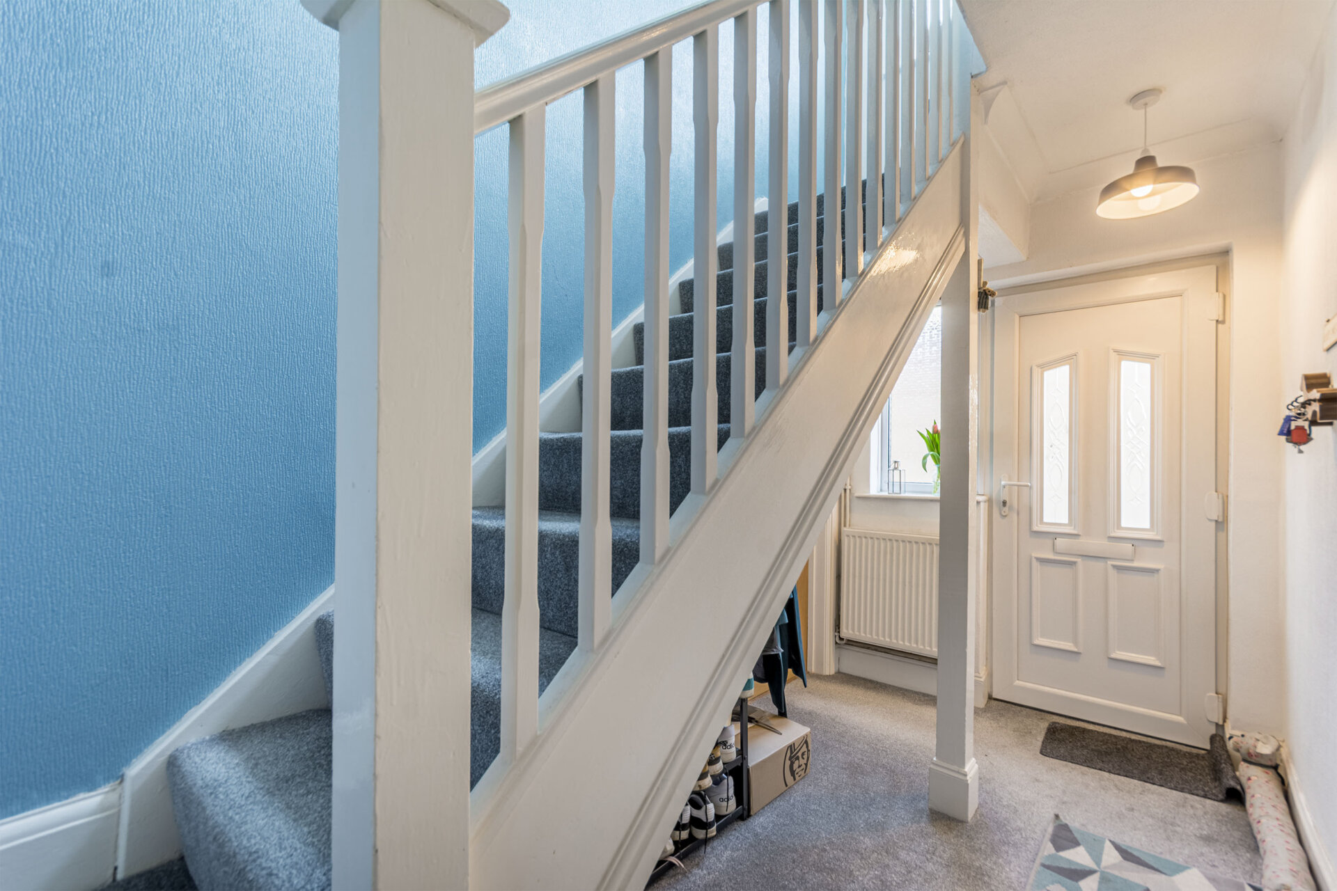 Double glazed door to enter into the hallway with carpet flooring, radiator opaque double glazed window to the left elevation, understands cloaks area, stairs ascending and doors to