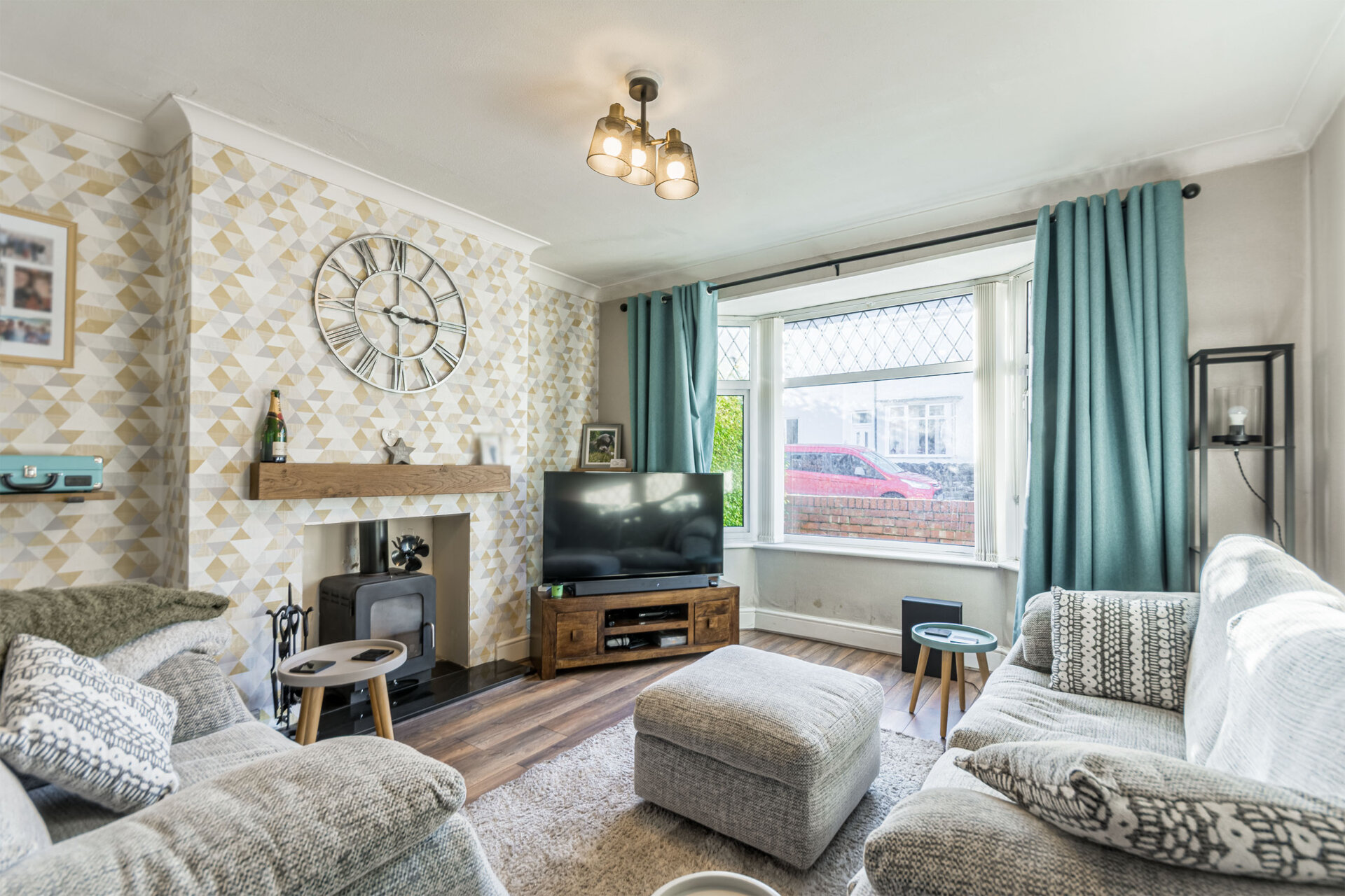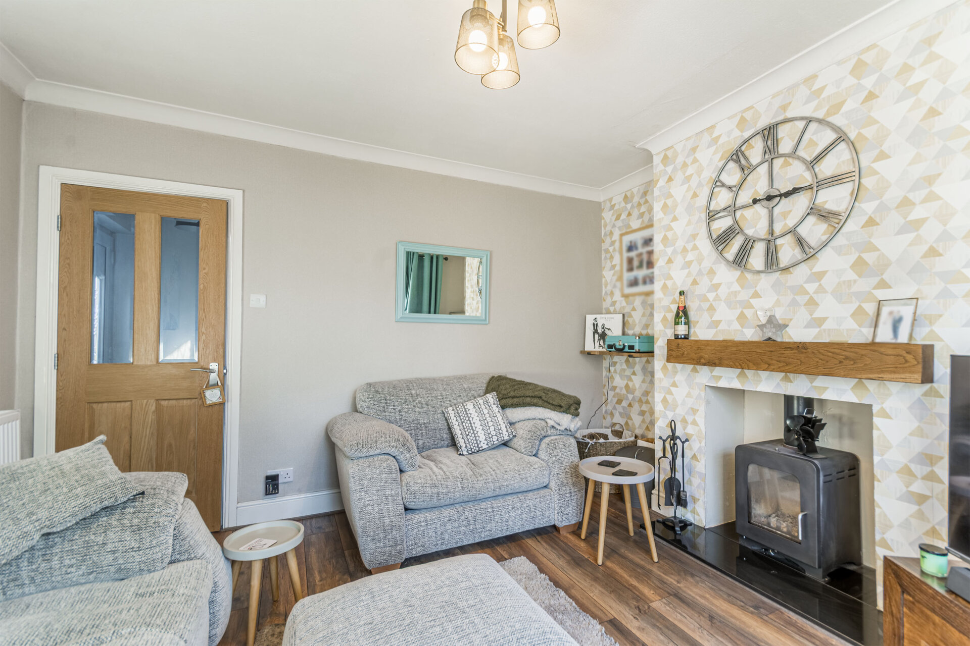 Double glazed bay window to the front elevation, wood effect flooring, chimney breast, with inset wood burner, with wood mantle piece, recess alcoves to either side, radiator.