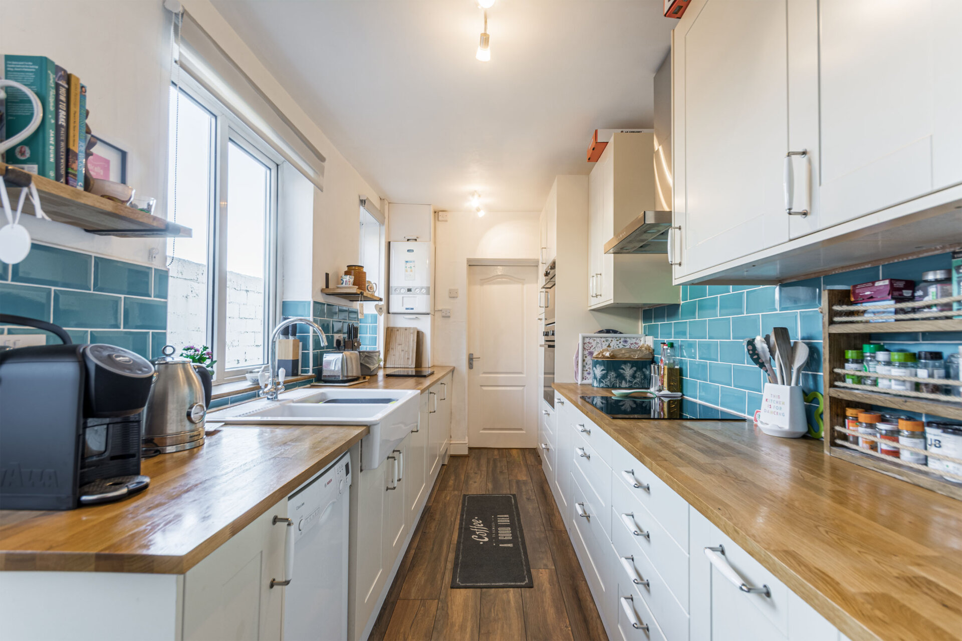 An updated kitchen with a range of wall and base units square top wood work surfaces, tiled splash backs, double sink with mixer tap over, space for Slimline dishwasher, standing height of an grill microwave combo, electric hobs with extractor over, integrated fridge freezer, two double glazed windows to the left elevation, wall mounted combination boiler, double glazed door to the left elevation, radiator and continued wood effect flooring. Door to Utility WC.