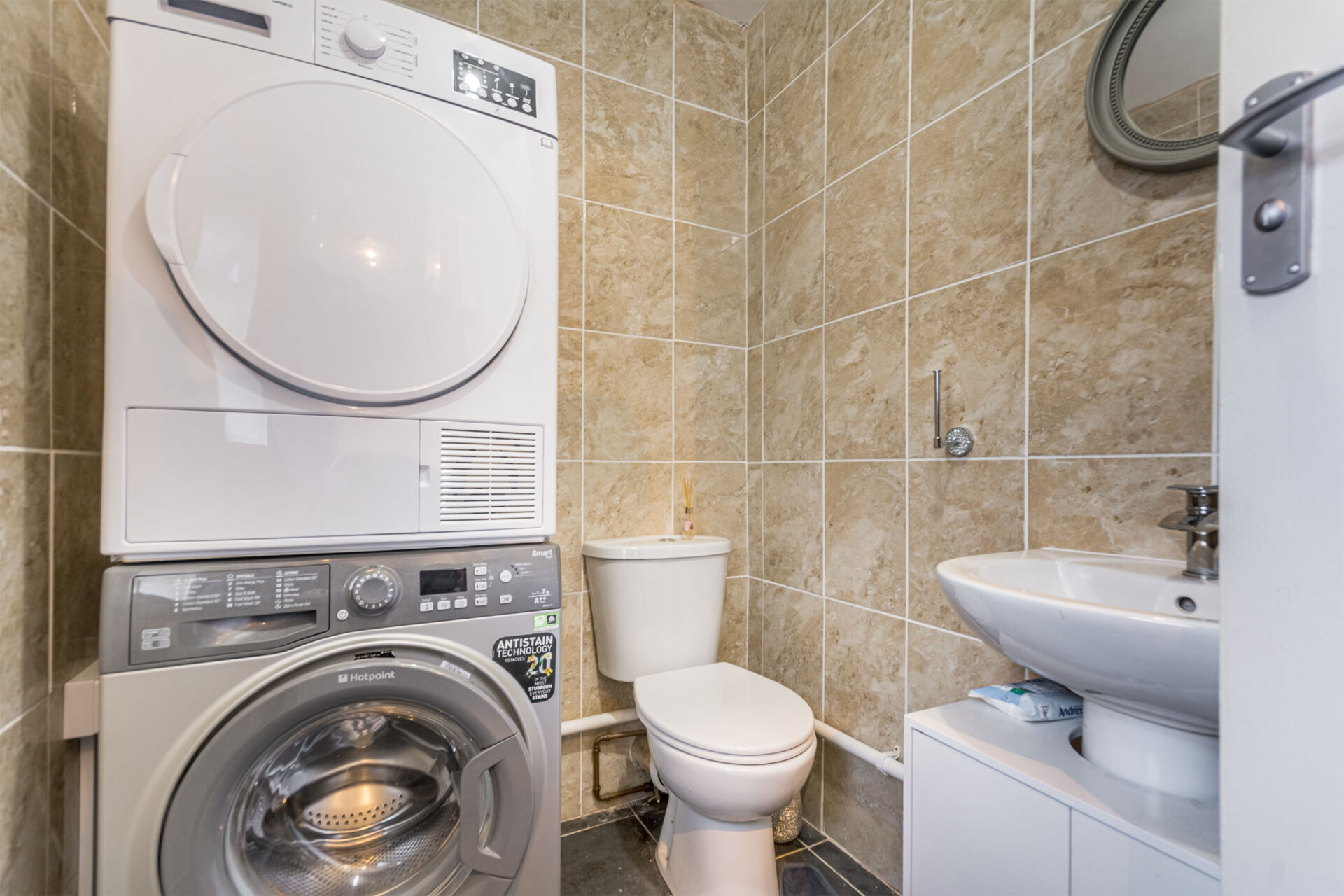 A great cloaks/ utility . Tiled flooring, radiator, WC, and pedestal wash hand Basin, opaque double glazed window to the left elevation and tiled walls.