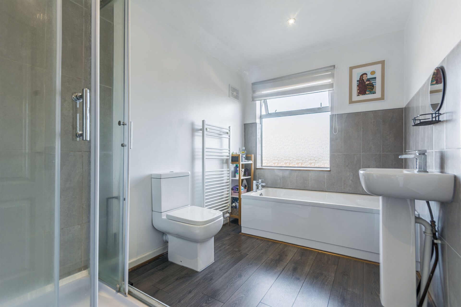 A superb four piece bathroom suite comprising a corner shower cubicle with waterfall shower , tiled splashbacks, pedestal wash hand Basin, panelled bath, low flush WC, tiled walls, ladder style heated towel radiator, opaque double glazed window to the rear elevation and wood effect flooring.