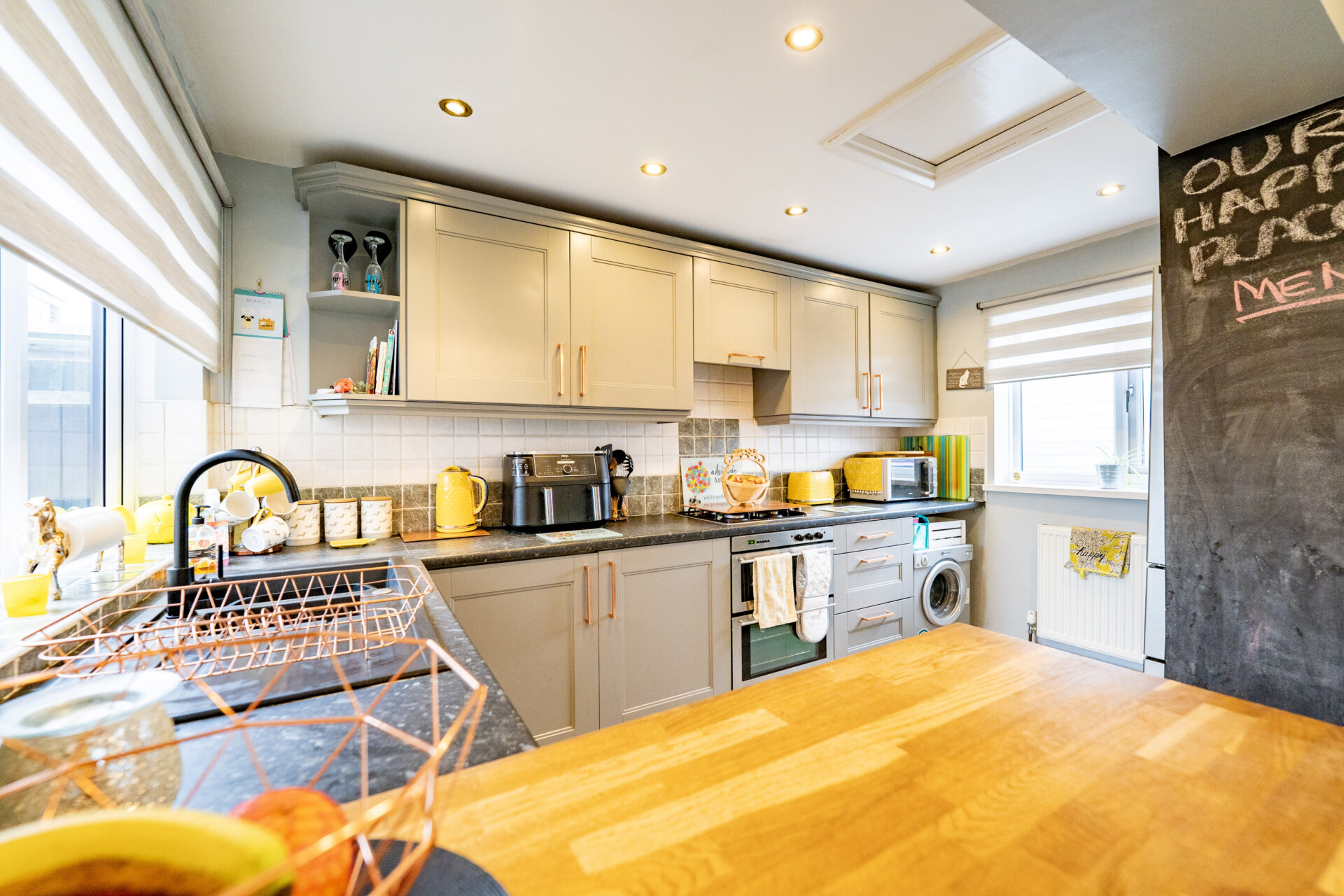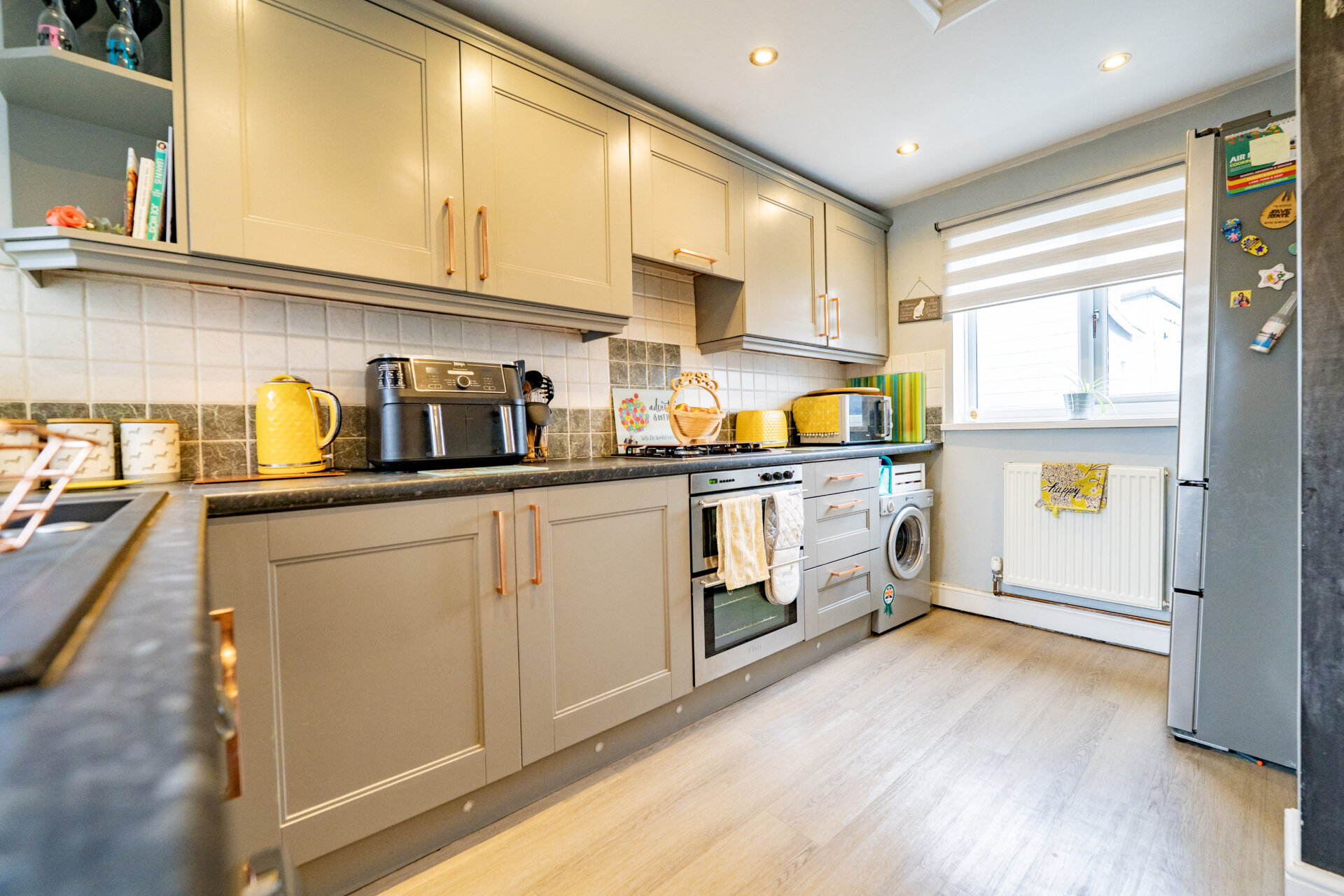 Kitchen Area - Wall, base and drawer units with work surface over, sink/waste/drainer unit with Swan mixer tap over, tiled walls and splashbacks, built-in oven/grill, hob and extractor hood over, plumbing for automatic washing machine, UPVC double glazed window to the front and side, breakfast bar, radiator and open to