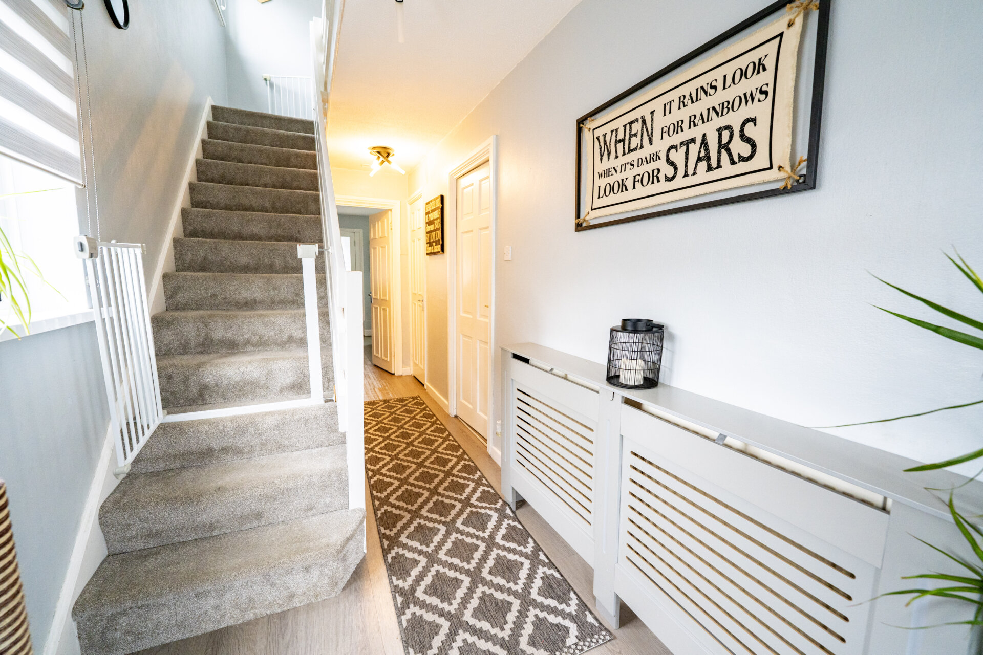 Stairs to the first floor landing, UPVC window to the side, composite front entrance door, vinyl tile floor, door to under stairs storage cupboard, radiators and door to