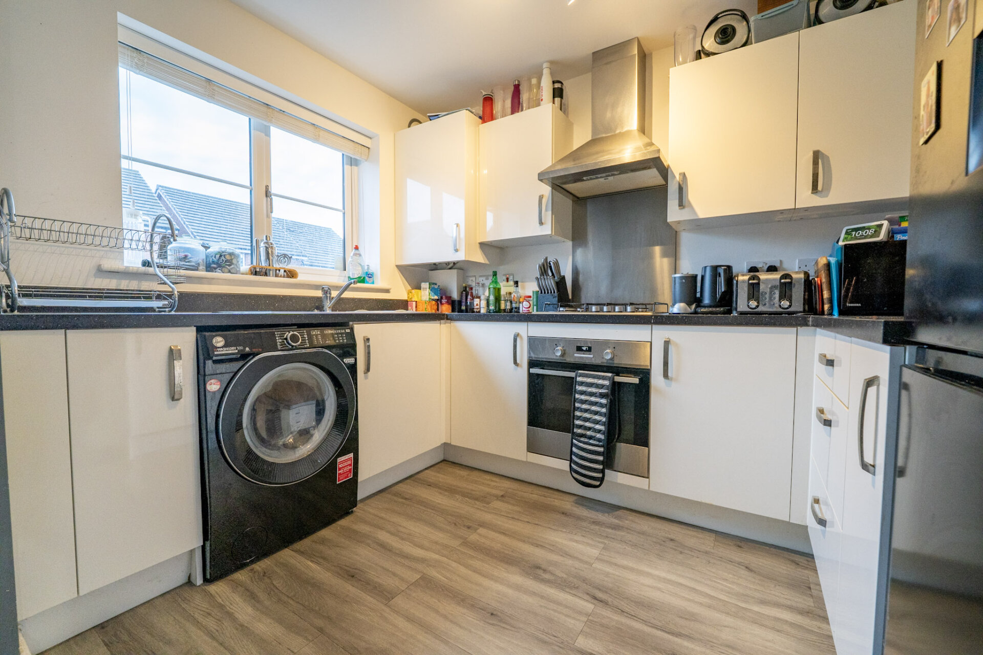 A modern and spacious kitchen with a range of wall and base units, roll top work surfaces, sink and drainer with mixer tap, inset gas hobs and electric oven with extractor hood, space for washing machine and fridge freezer, wall mounted boiler housed in unit, double glazed window to the front elevation.