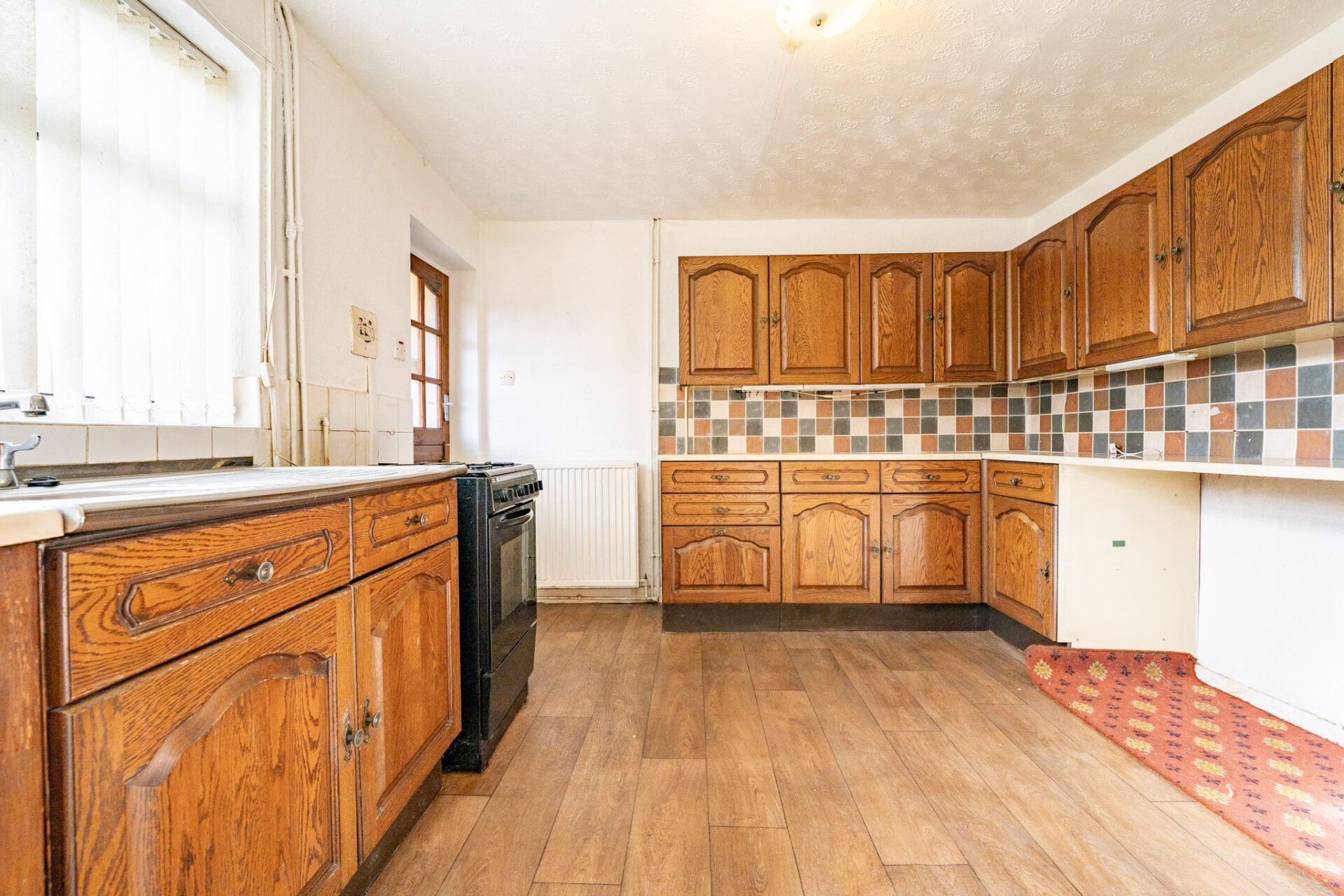 A range of wall and base units with roll top work surfaces, sink and drainer with mixer tap over, space under counters for all white goods/ appliances, under stairs storage, double glazed window to the rear and door to the rear lobby.