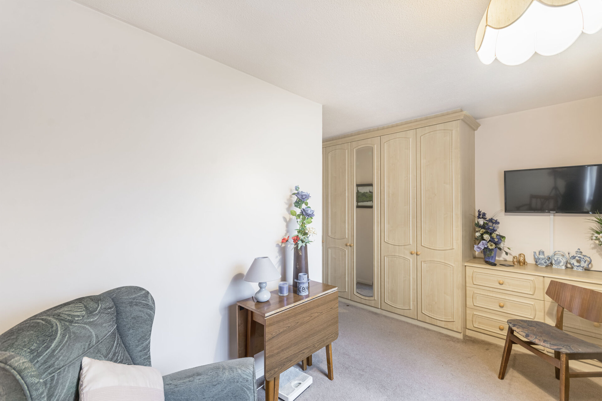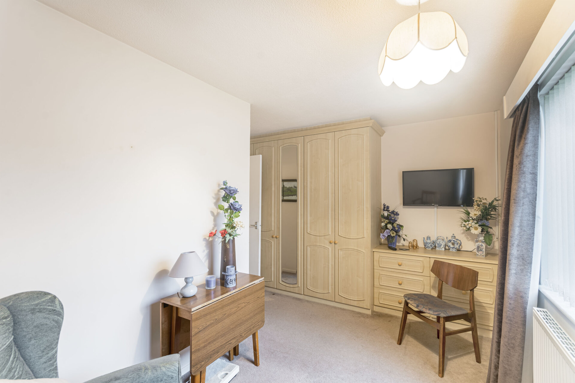 A bright and spacious main bedroom with double glazed window to the front elevation, carpet flooring, radiator and fitted wardrobes along one wall.