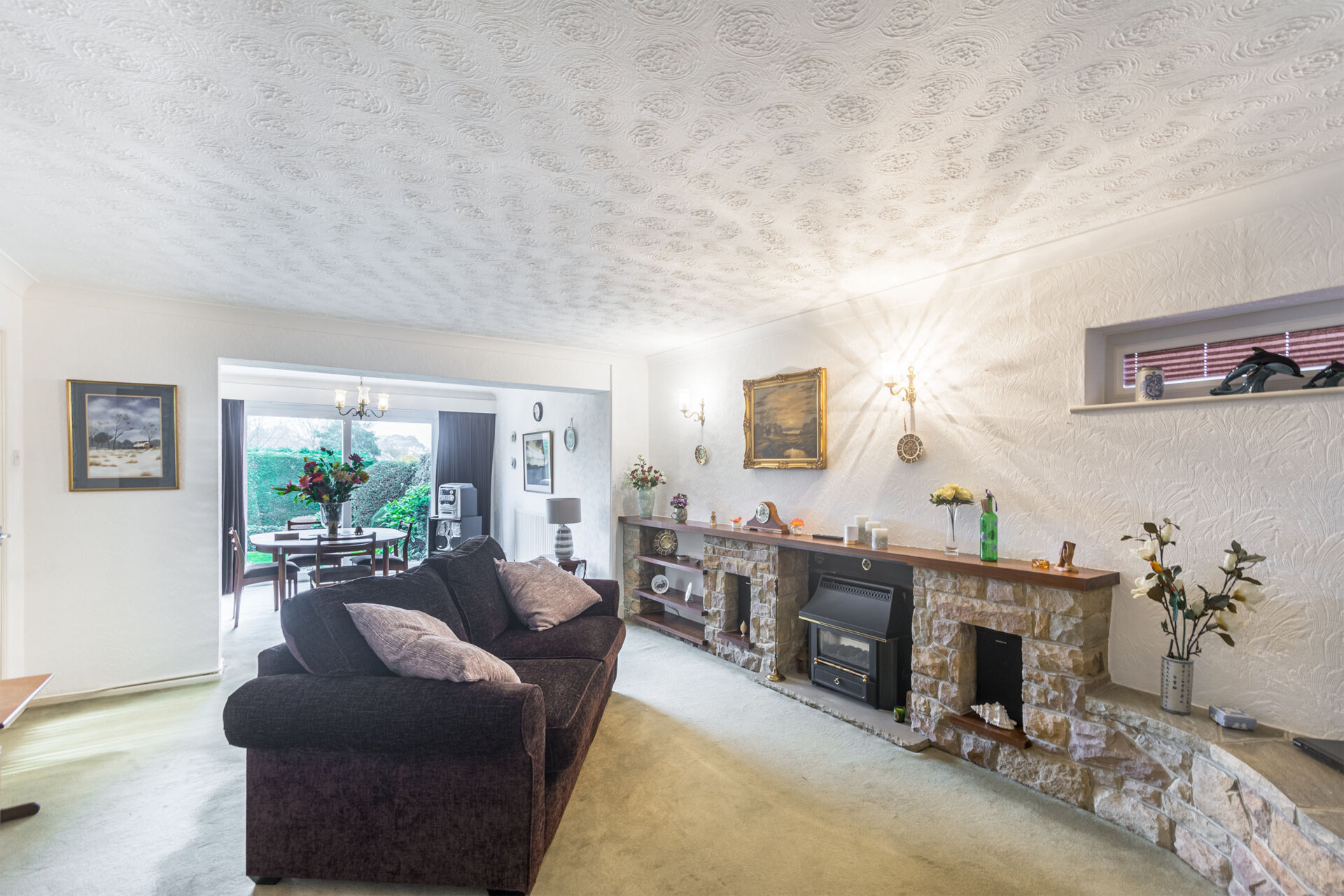 A wonderful lounge with carpet flooring, radiator, gas fire with surround, open arch leading to the dining room.