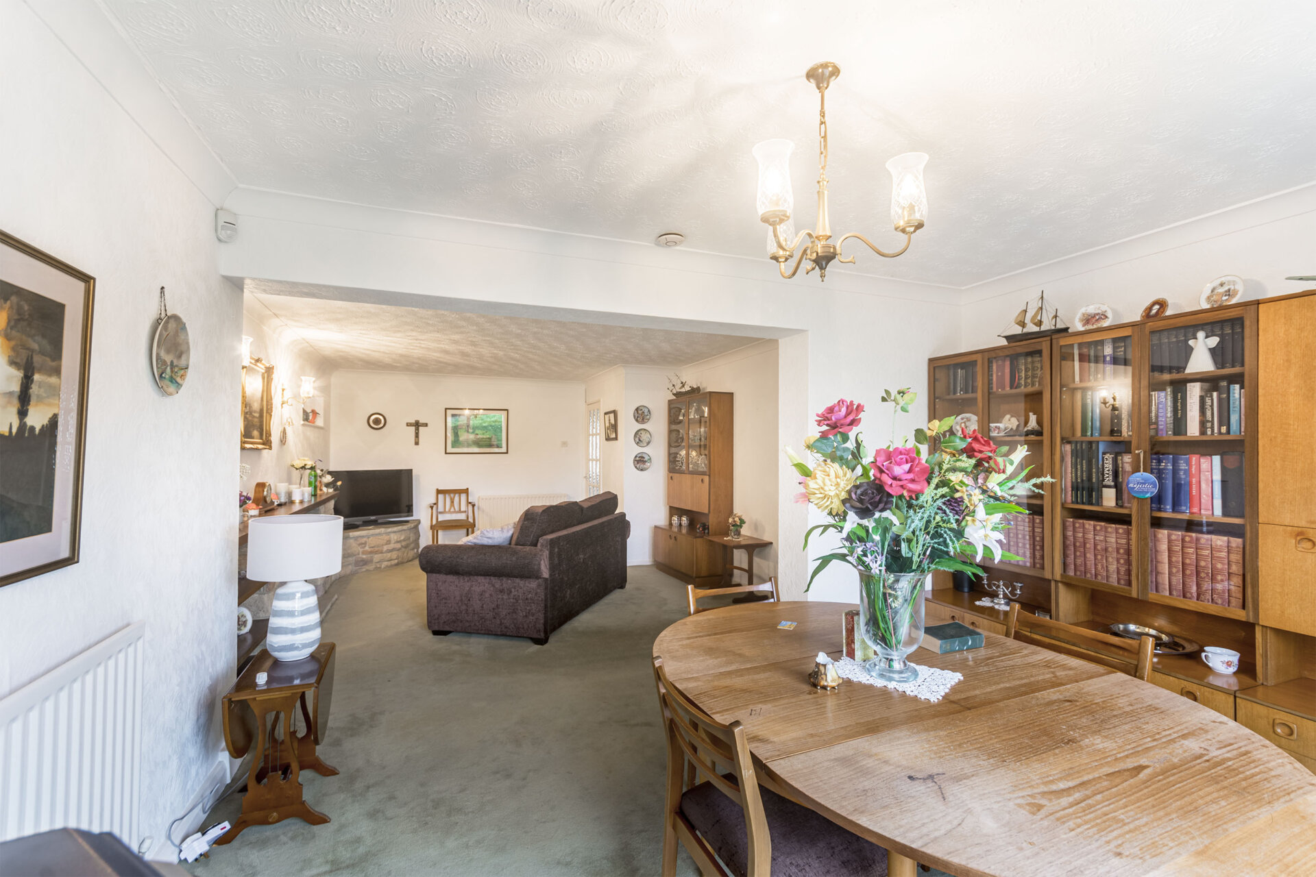 Another great reception room currently used as a dining room, continued carpet flooring, radiator and double glazed sliding doors to the rear elevation.
