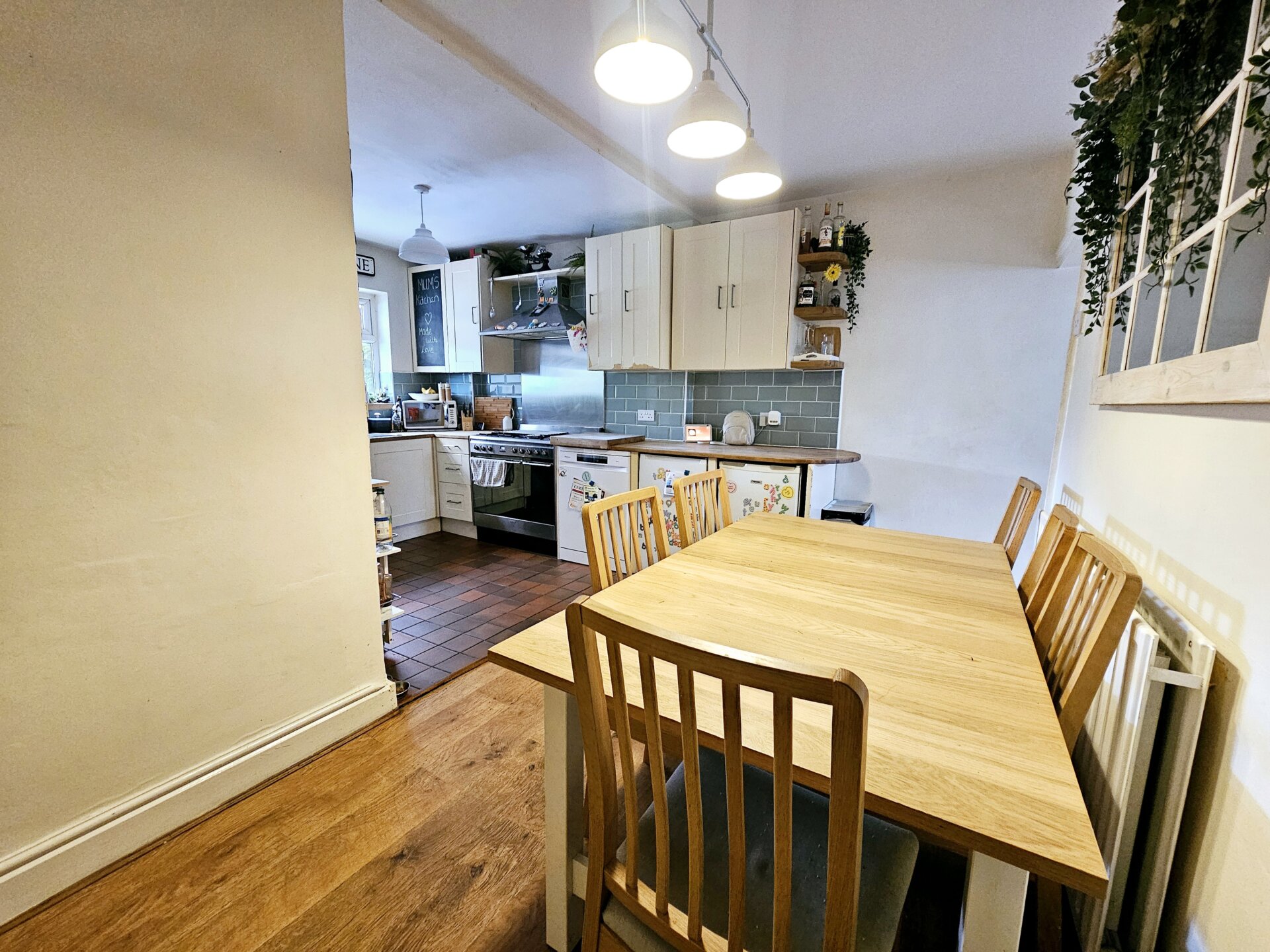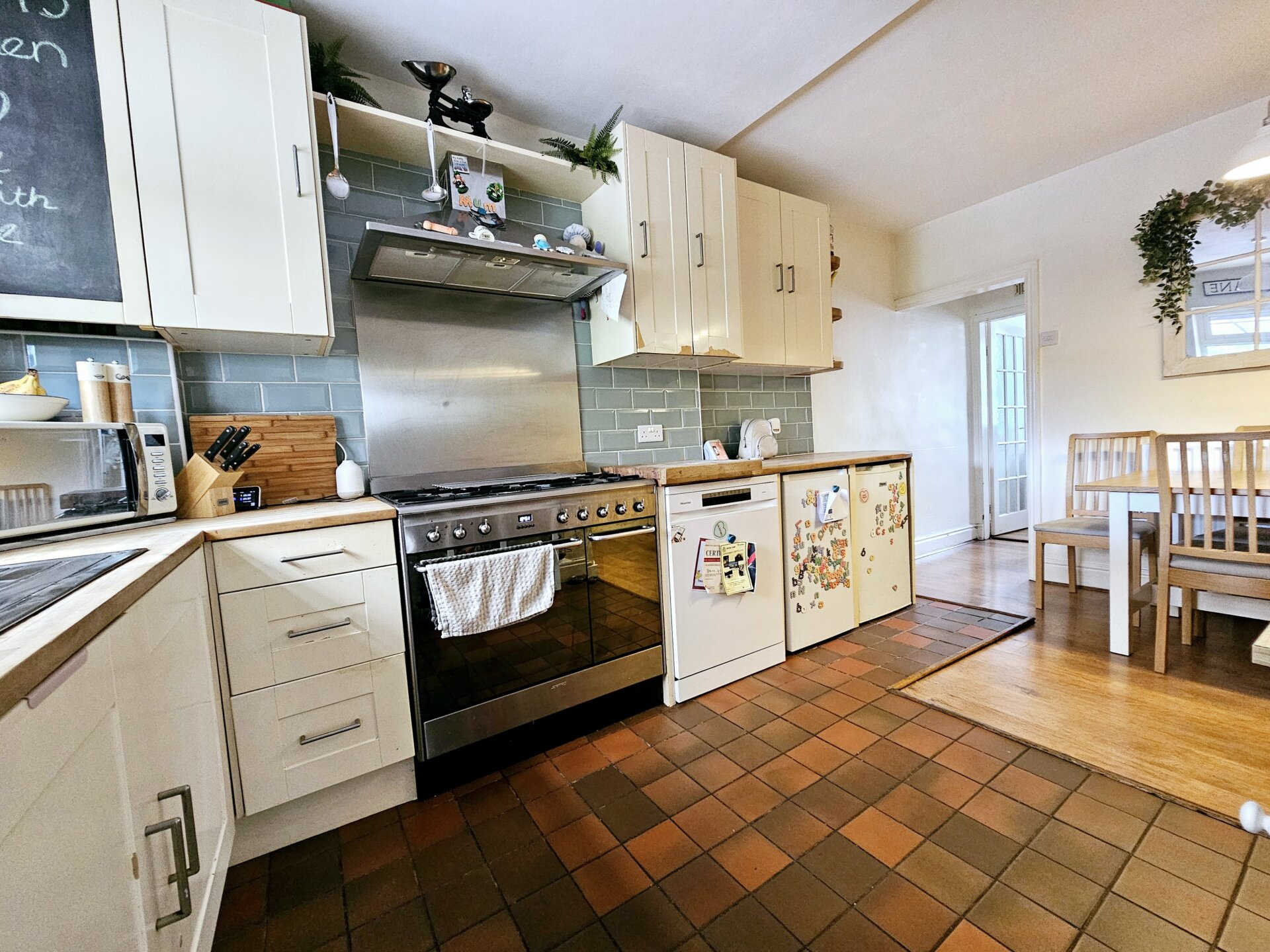 Range of wall and base units with wood top work surfaces, tiled splash backs, one and a half bowl sink and drainer with mixer tap over, space for under counter fridge, washing machine, dishwasher, smeg double oven with extractor hood. Dining area with ample space for dining table and chairs, radiator, cupboard for understairs storage, double glazed window to the rear elevation, with doors to;