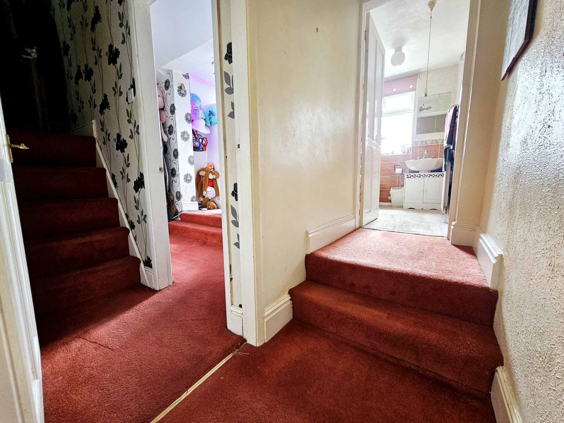 Carpet to both stairs and split landing with doors to