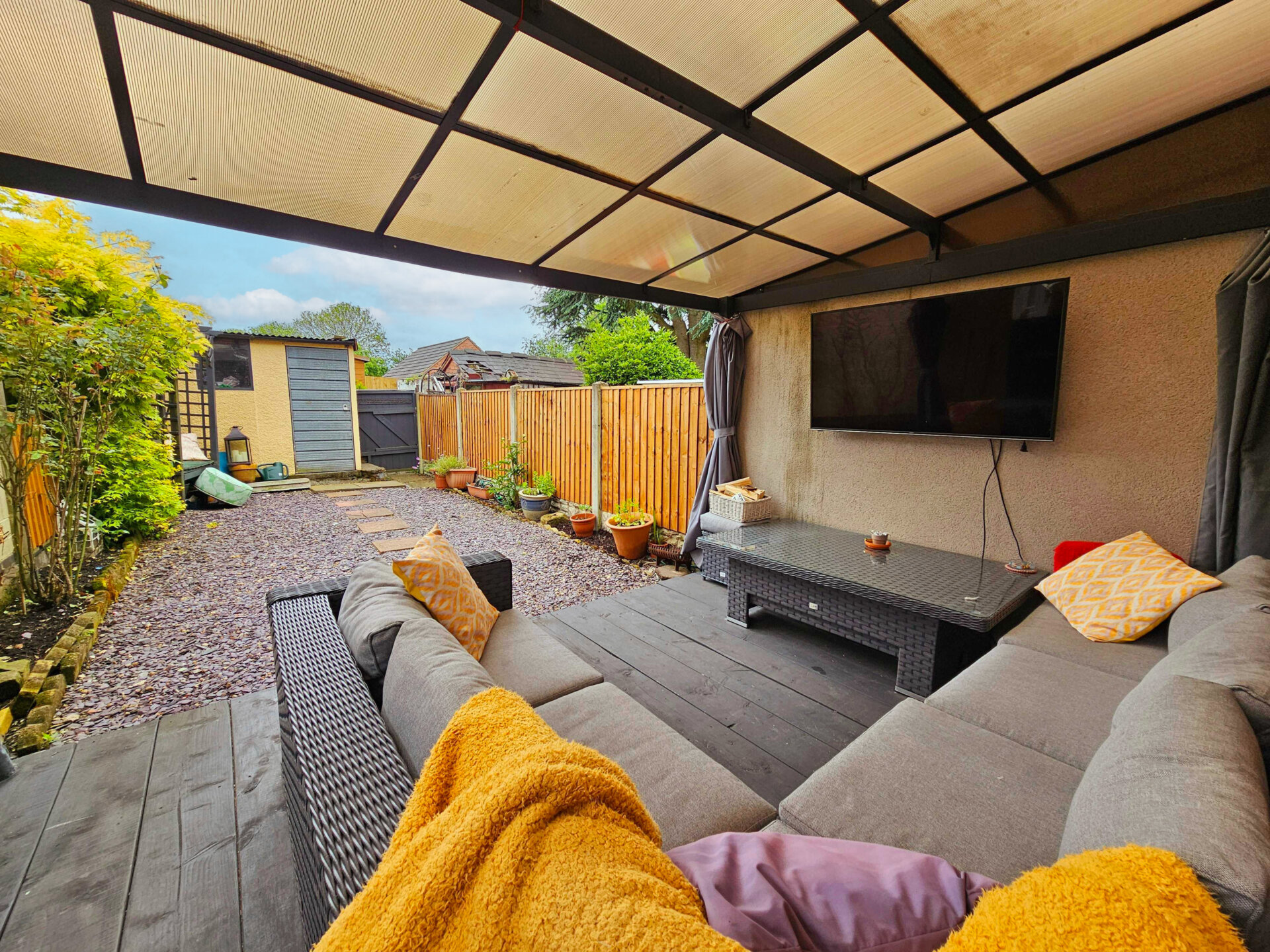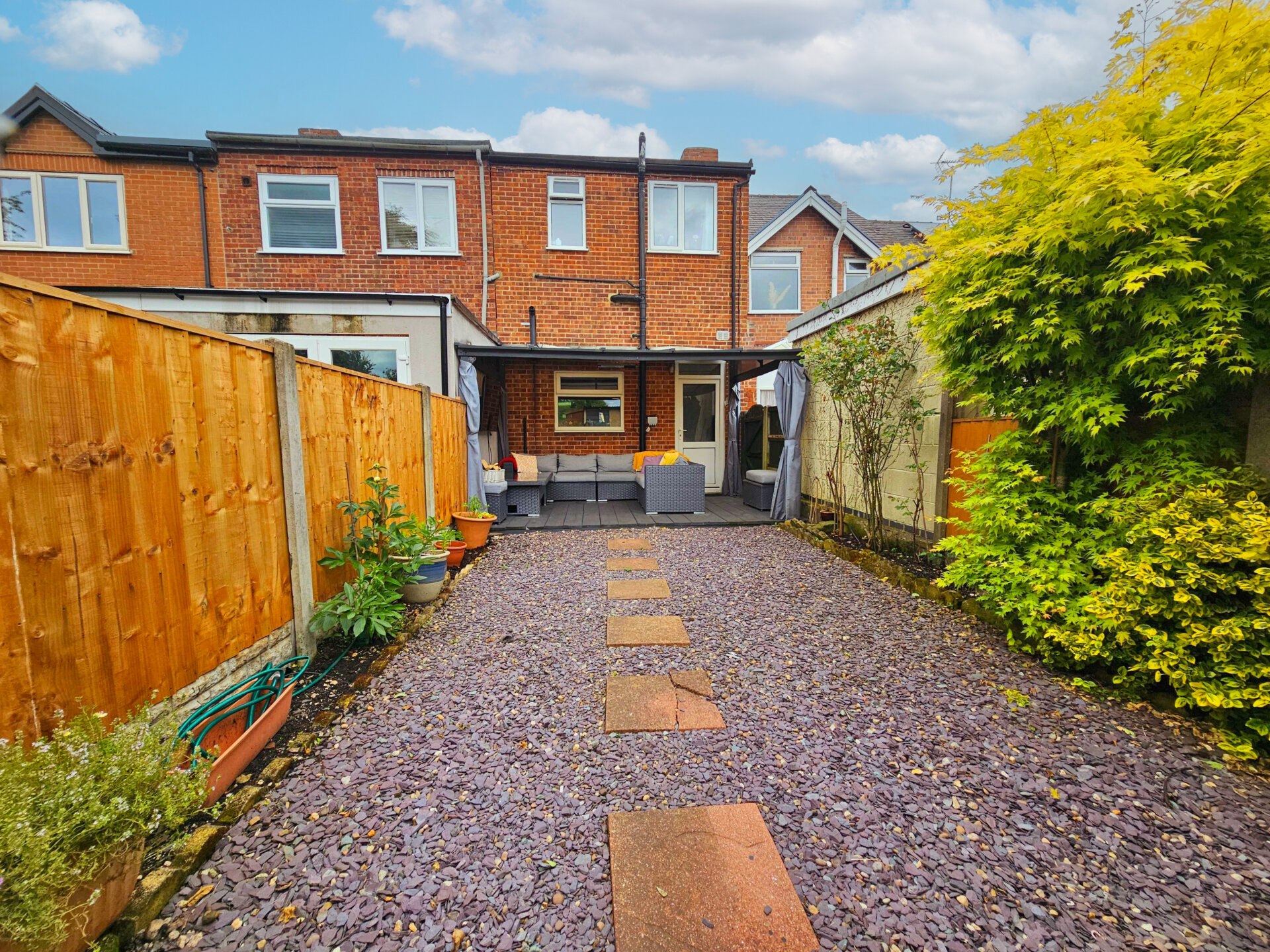 Parking space for two cars on the driveway and the added bonus of a garage to the rear. Residents will appreciate the proximity to local bus links, making commuting a breeze, as well as convenient access to the nearby supermarket, amenities, and local high street shops. The low maintenance garden is a true gem, featuring an undercover seating area perfect for relaxing or entertaining guests.