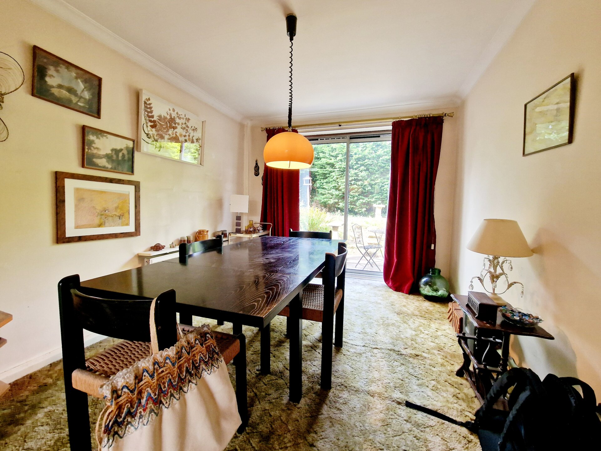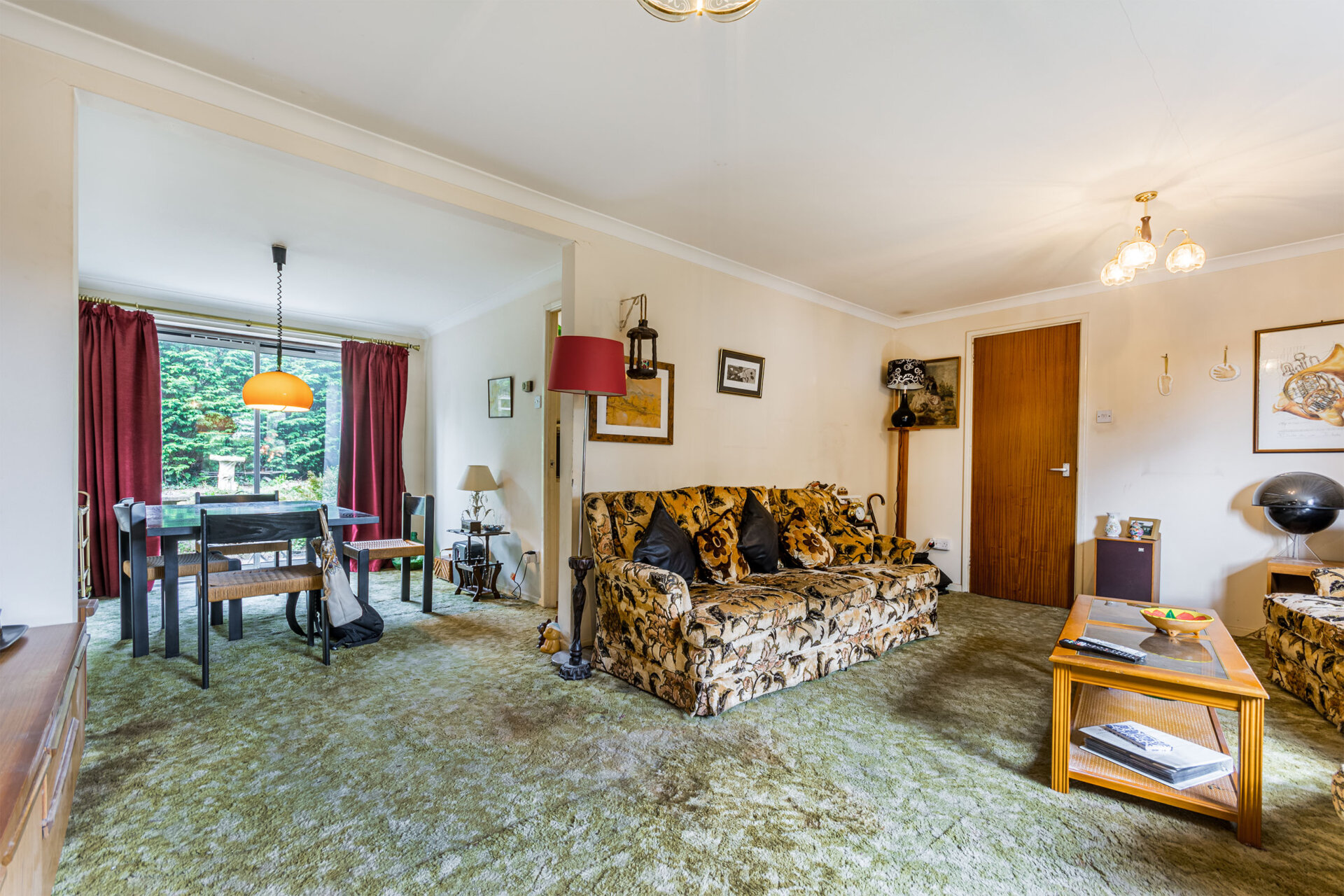 Another great reception room with carpet flooring, radiator and plenty of space for dining with sliding patio door to the rear.