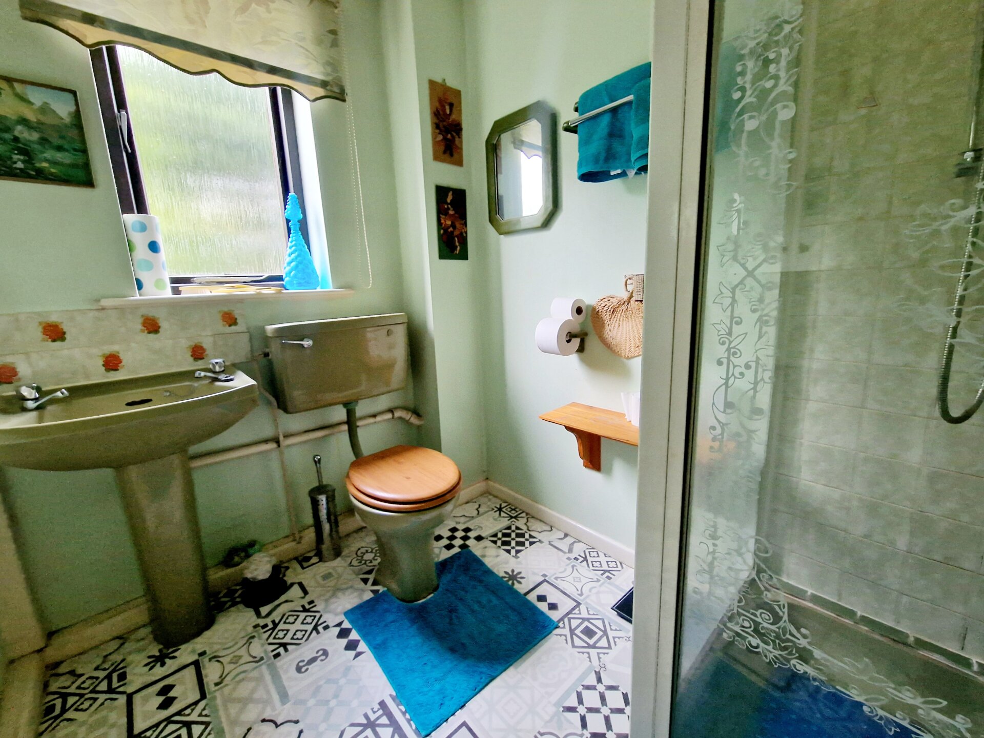 A three piece shower room comprising of a corner shower cubicle with pump shower over, pedestal wash hand basin, wc, radiator and opaque window to the rear.